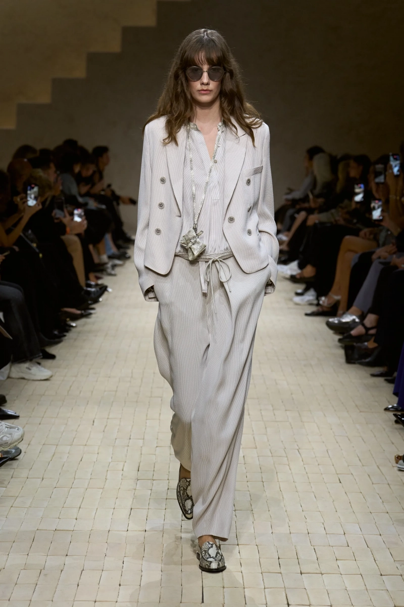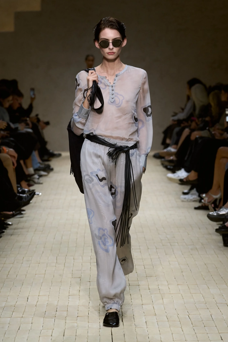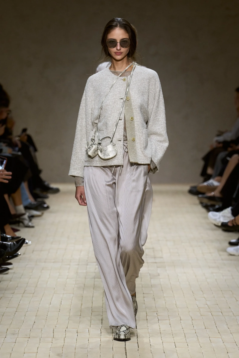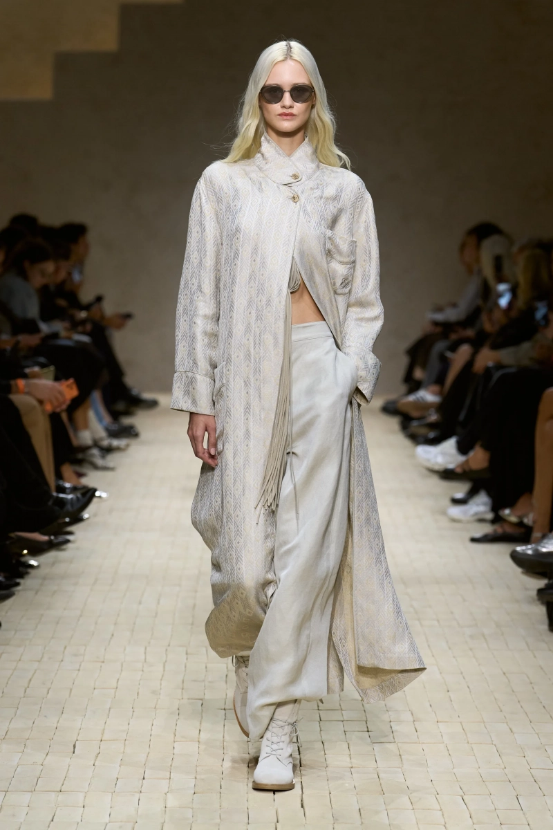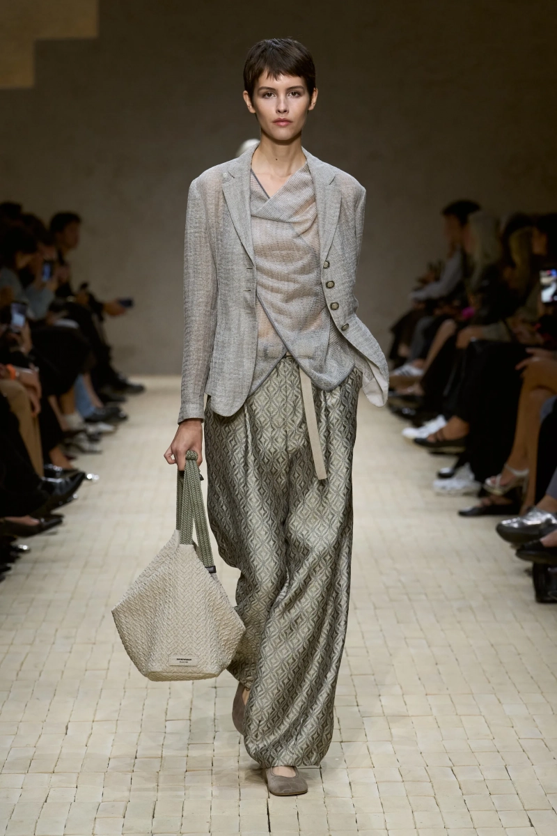 Коллекция опиралась на пограничное пространство между путешествием и возвращением. Одежда для тех, кто только что вернулся издалека, с частицами чужого песка, всё ещё прилипшими к вам, но взгляд на дом обострён расстоянием. Открывающая часть — грейжевая симфония постсафари одежды, смягчённой рукой Armani — включала шелк с металлическим блеском, сложное вязание, висящие пояски с бахромой и жакеты, открывающиеся, чтобы показать увядающий загар.