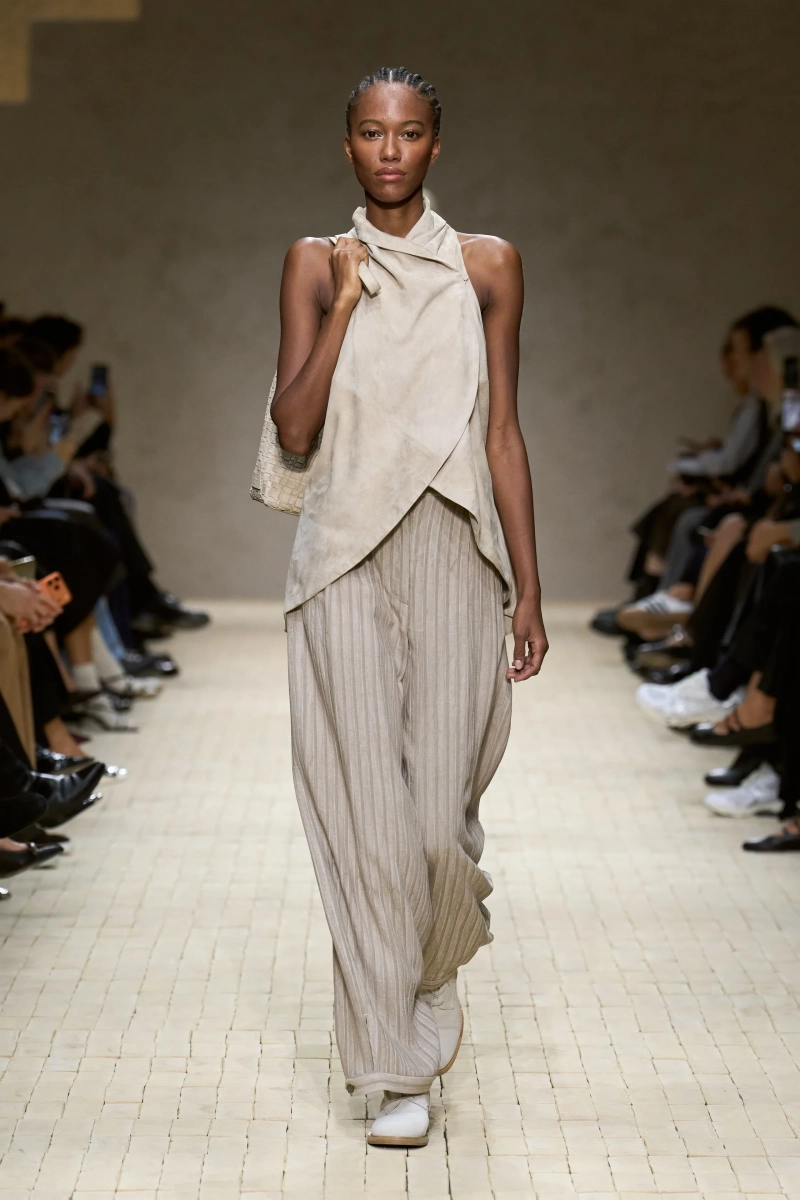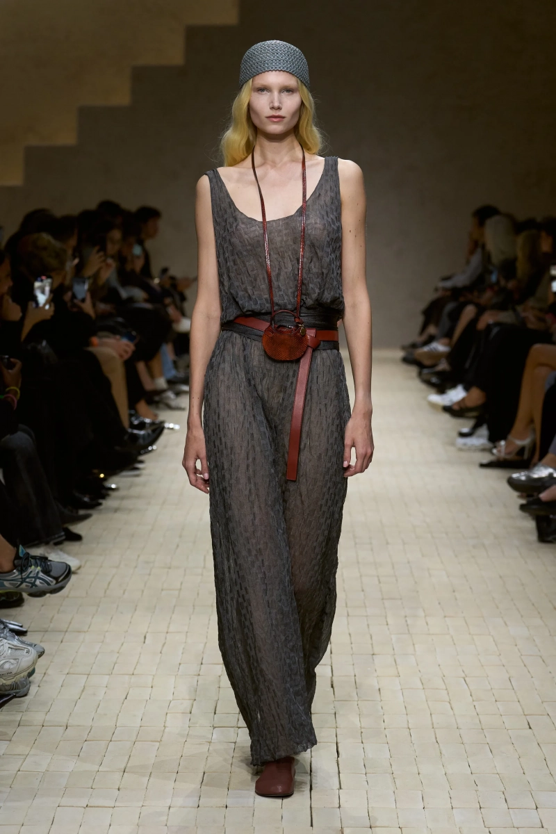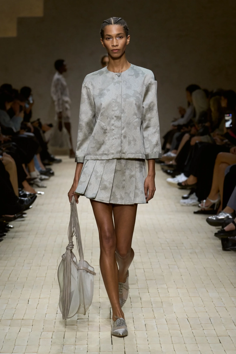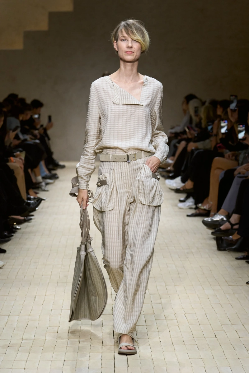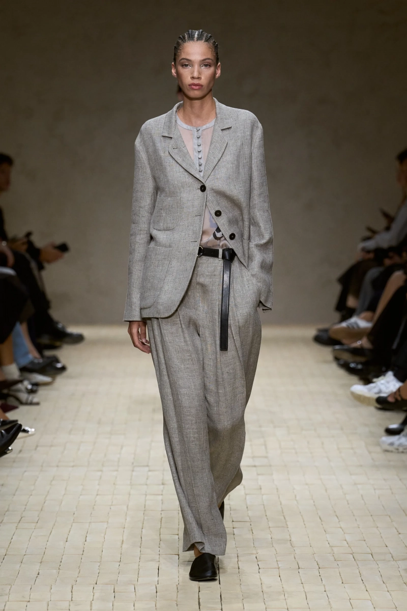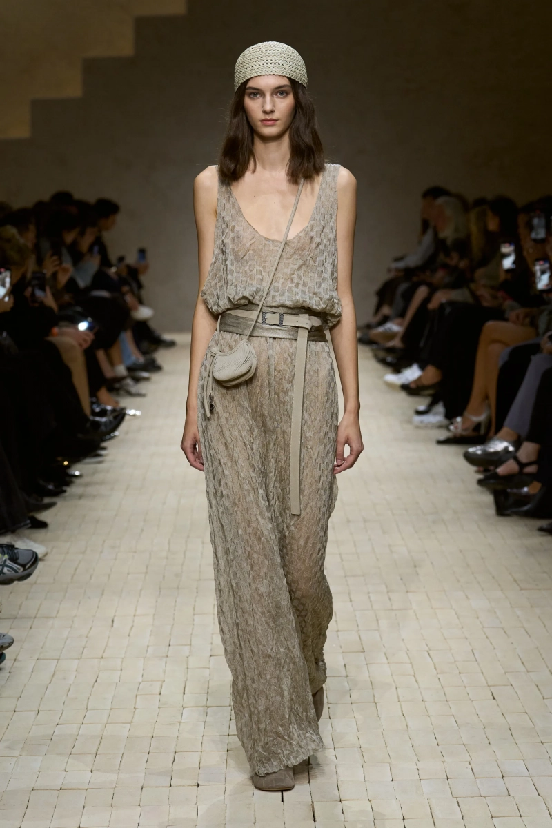 Коллекция опиралась на пограничное пространство между путешествием и возвращением. Одежда для тех, кто только что вернулся издалека, с частицами чужого песка, всё ещё прилипшими к вам, но взгляд на дом обострён расстоянием. Открывающая часть — грейжевая симфония постсафари одежды, смягчённой рукой Armani — включала шелк с металлическим блеском, сложное вязание, висящие пояски с бахромой и жакеты, открывающиеся, чтобы показать увядающий загар.