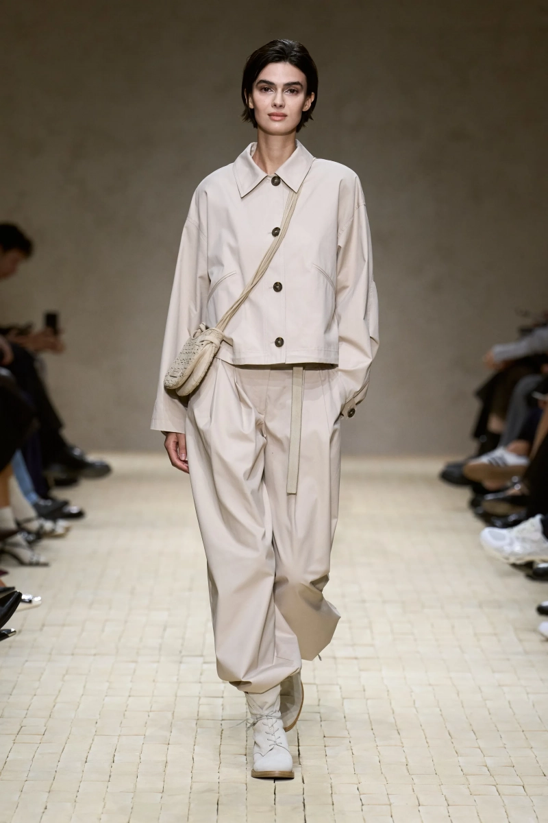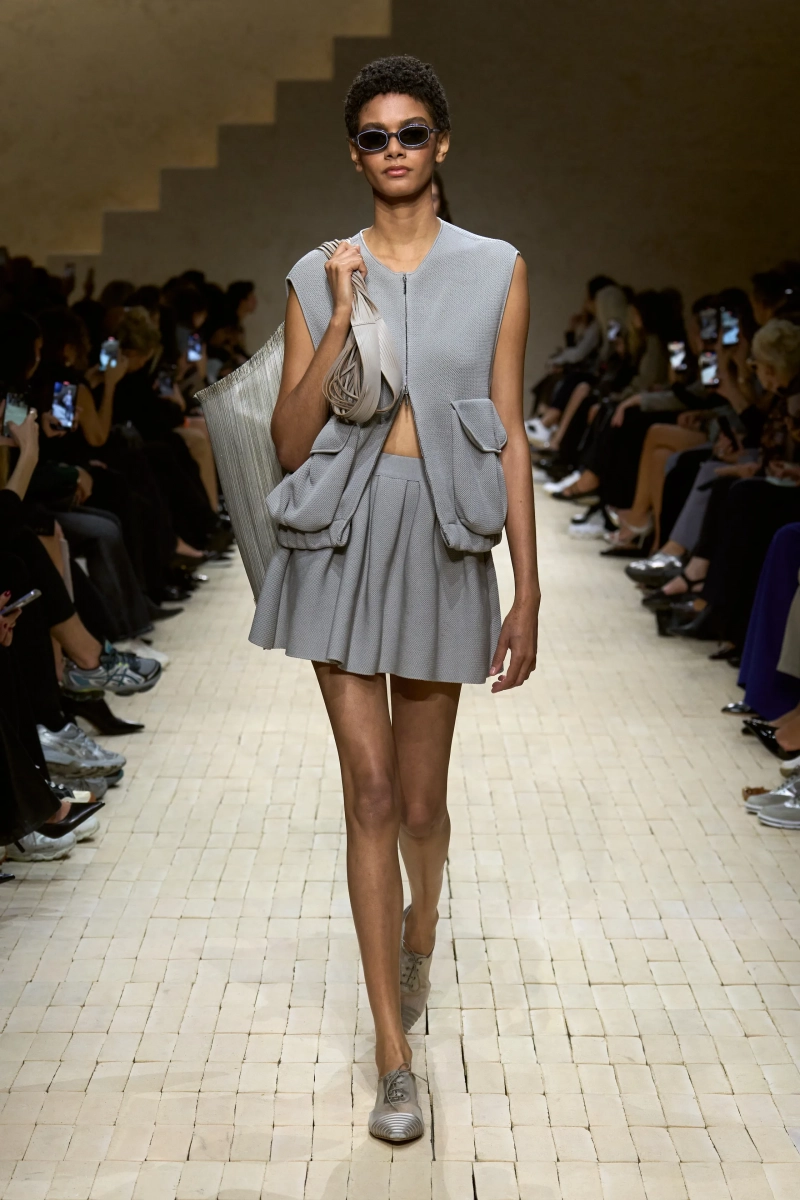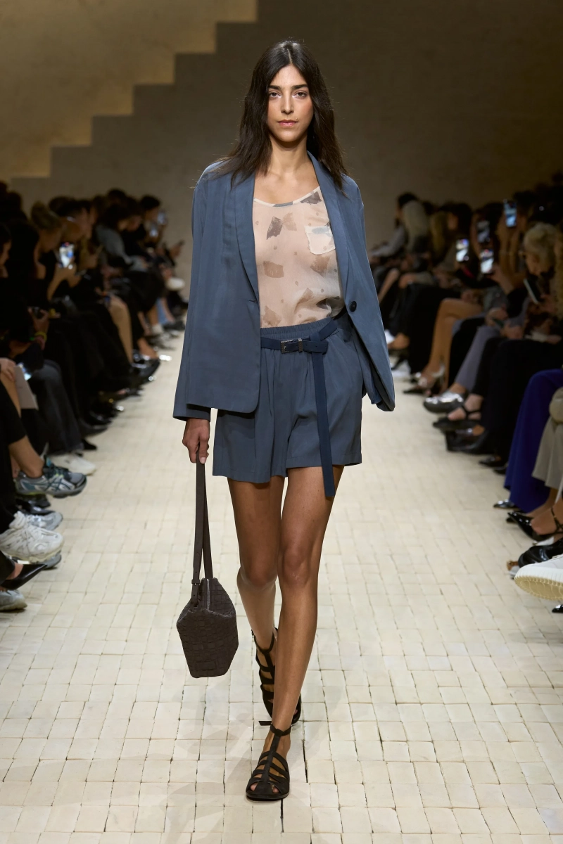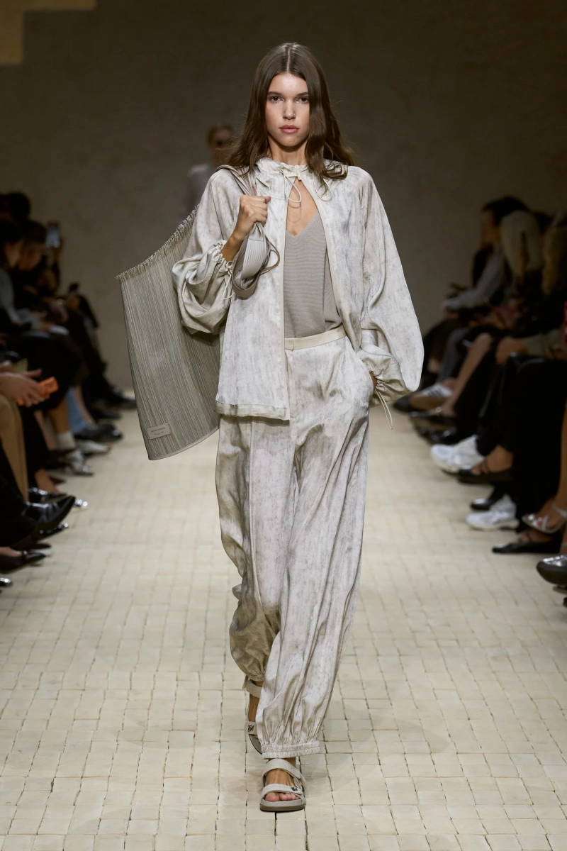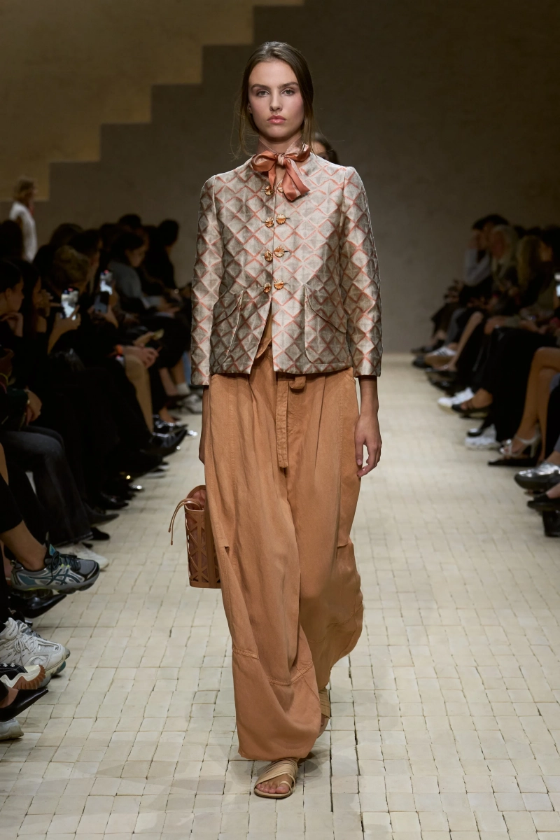 Коллекция опиралась на пограничное пространство между путешествием и возвращением. Одежда для тех, кто только что вернулся издалека, с частицами чужого песка, всё ещё прилипшими к вам, но взгляд на дом обострён расстоянием. Открывающая часть — грейжевая симфония постсафари одежды, смягчённой рукой Armani — включала шелк с металлическим блеском, сложное вязание, висящие пояски с бахромой и жакеты, открывающиеся, чтобы показать увядающий загар.