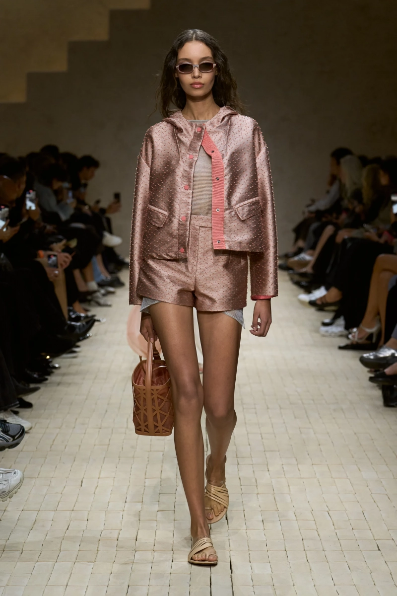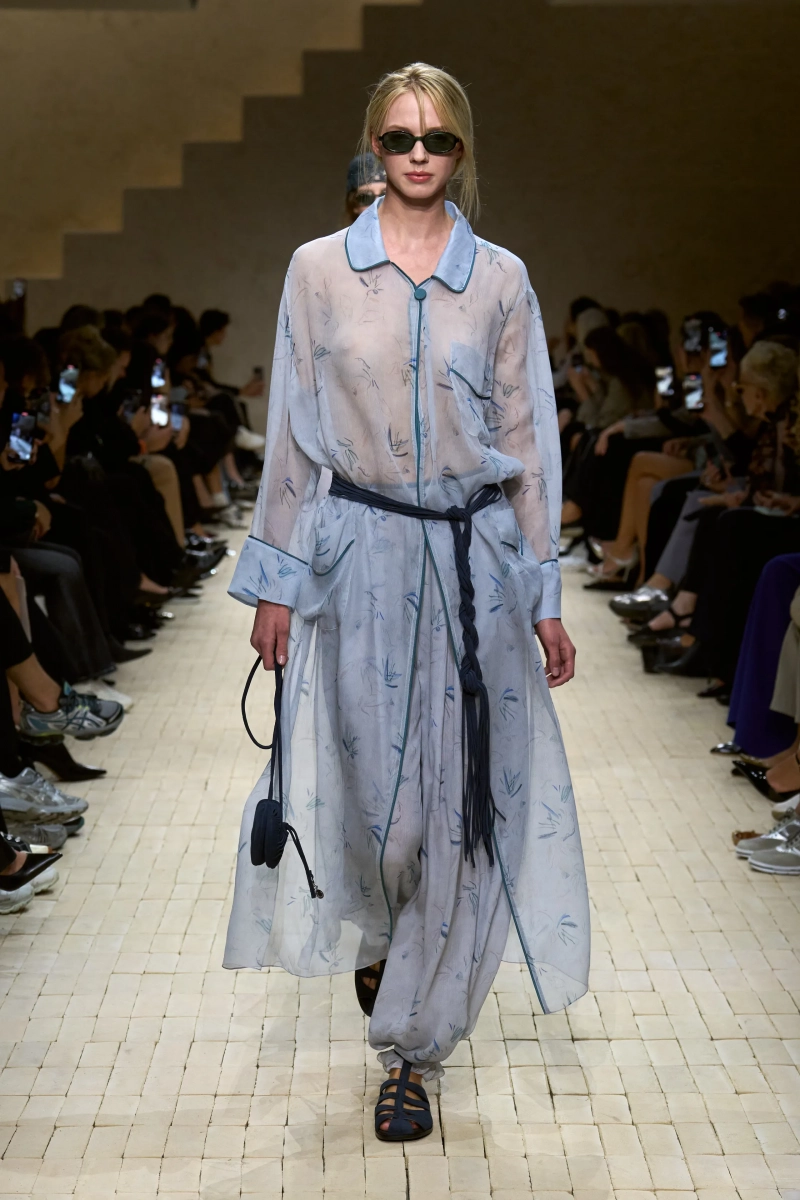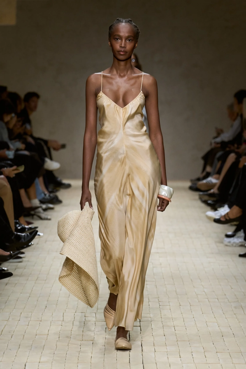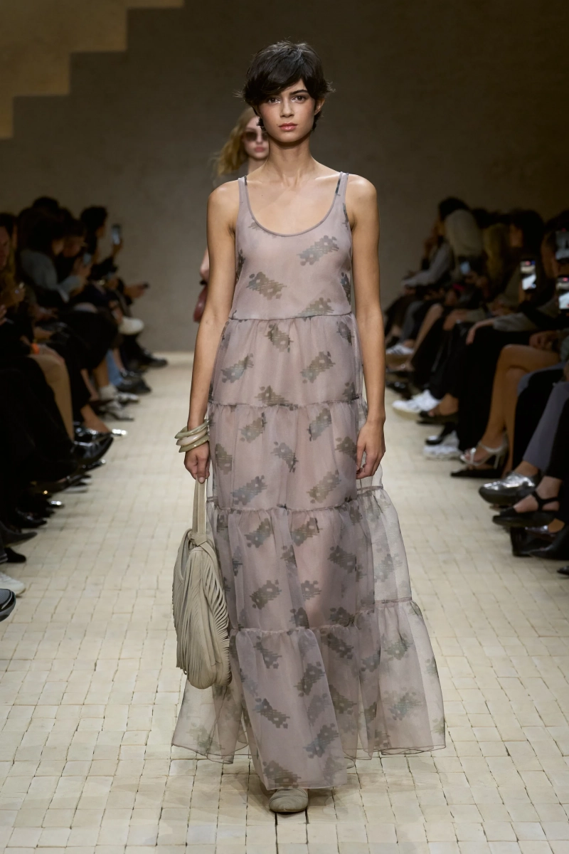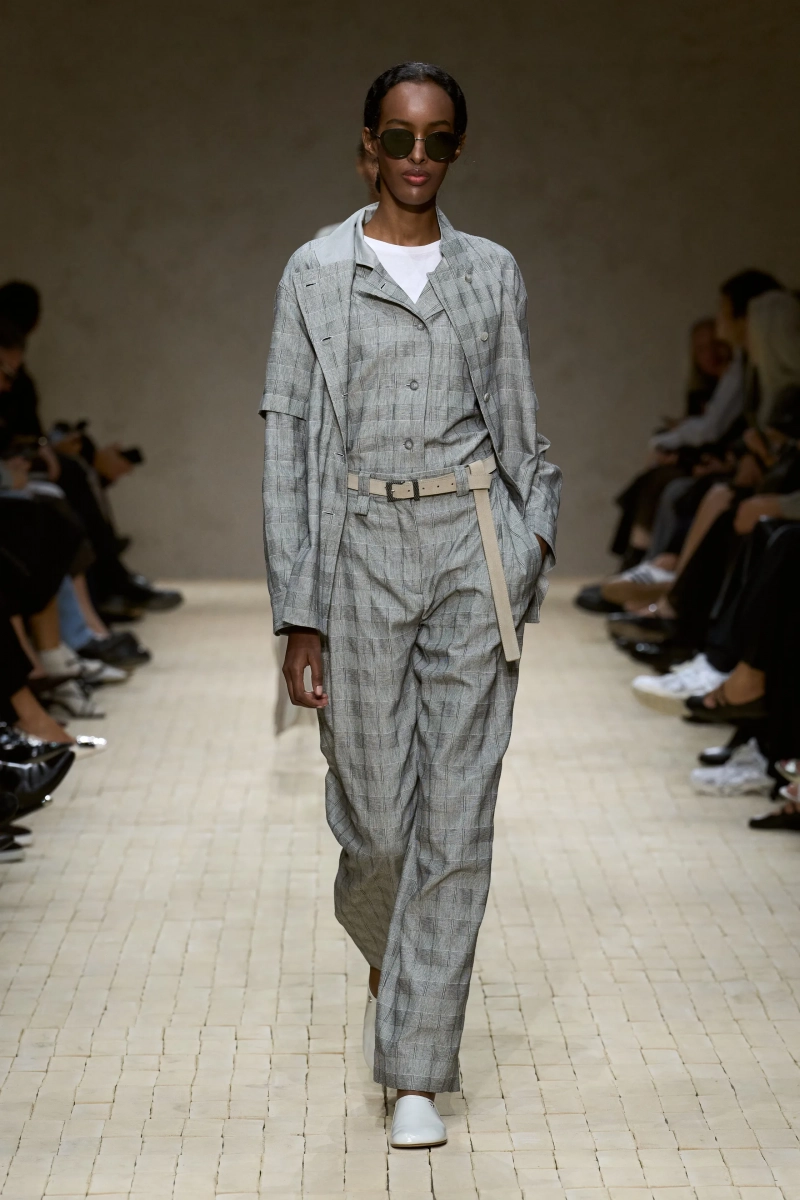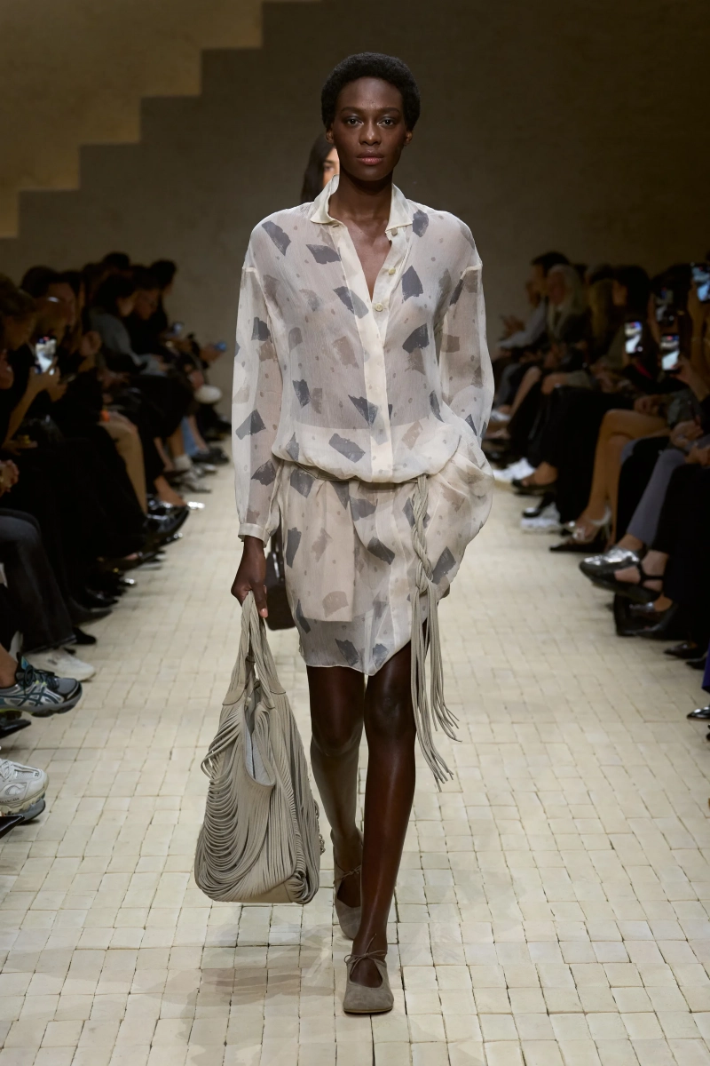 Коллекция опиралась на пограничное пространство между путешествием и возвращением. Одежда для тех, кто только что вернулся издалека, с частицами чужого песка, всё ещё прилипшими к вам, но взгляд на дом обострён расстоянием. Открывающая часть — грейжевая симфония постсафари одежды, смягчённой рукой Armani — включала шелк с металлическим блеском, сложное вязание, висящие пояски с бахромой и жакеты, открывающиеся, чтобы показать увядающий загар.