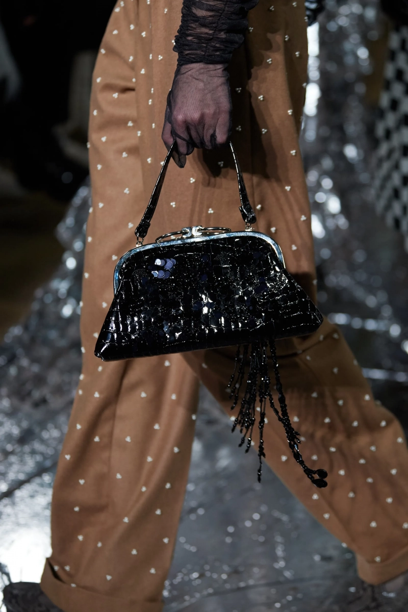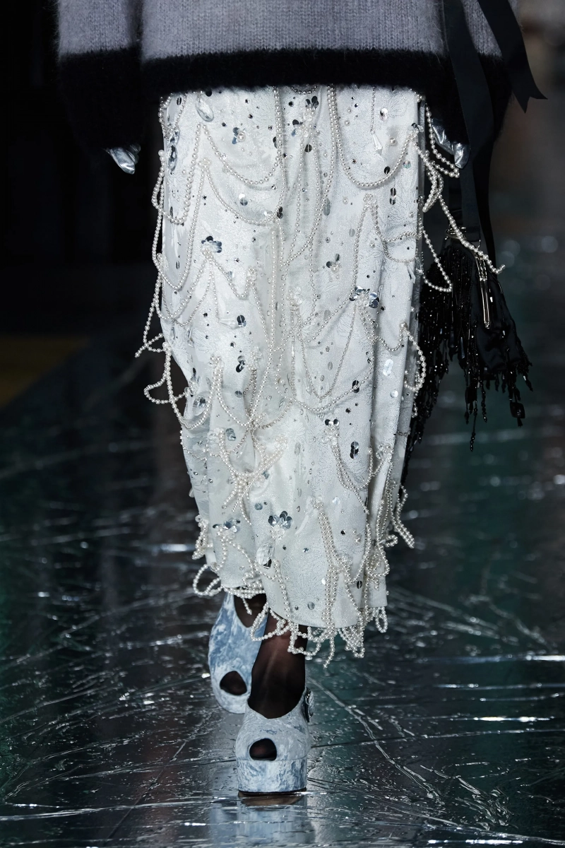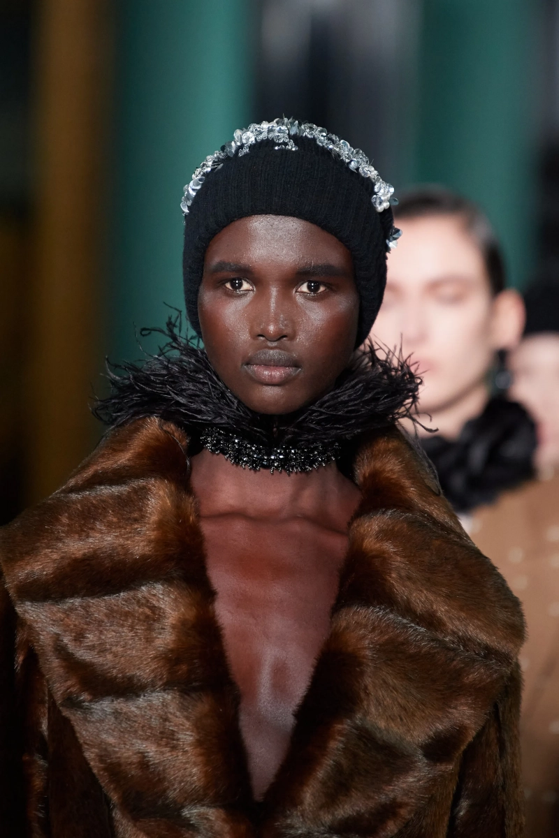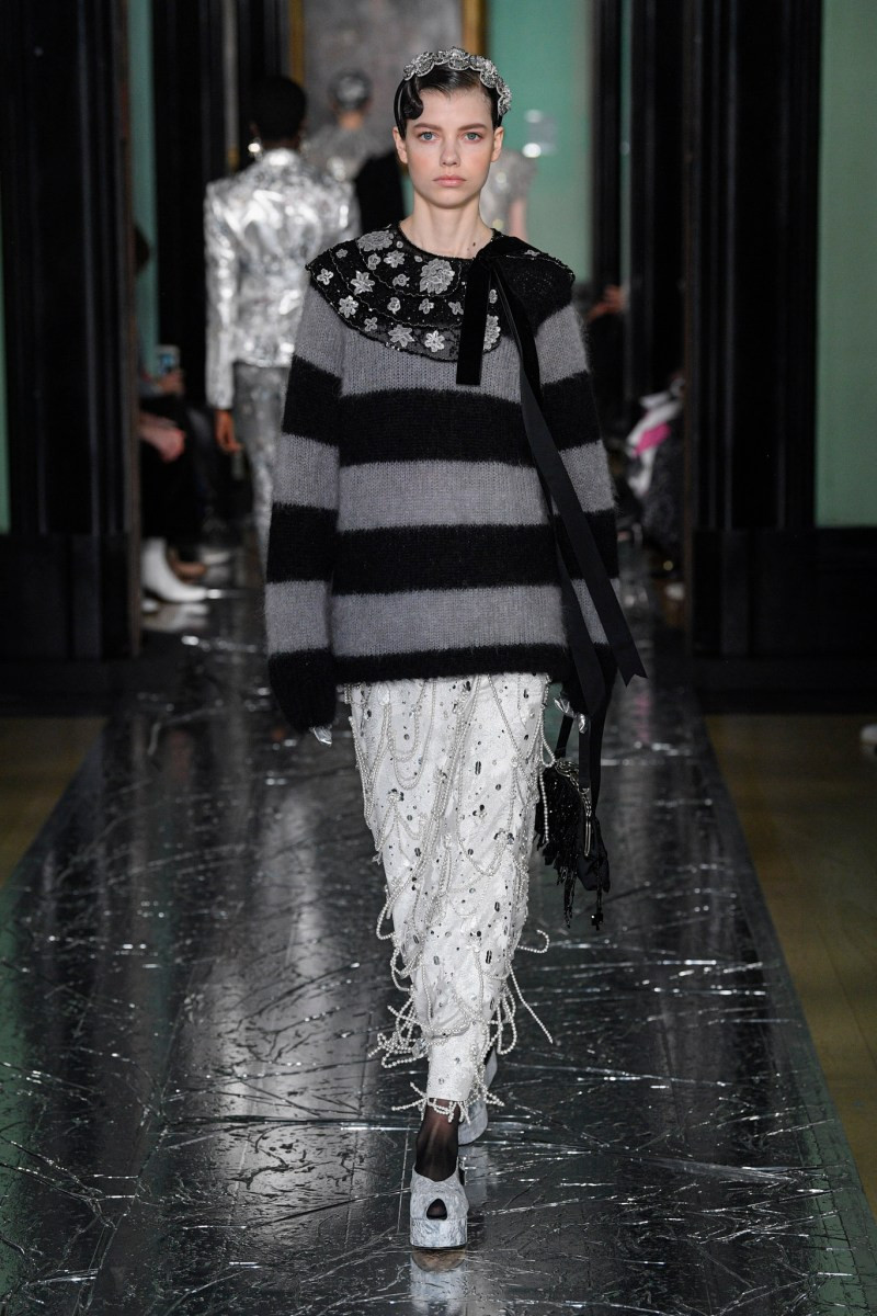 Не могу сказать, что я в полном восторге от этой коллекции, но нельзя не отметить чудесную работу с тканью. Прозрачная чёрная юбка с пиджаком с принтом в стиле Ар Деко смотрится просто потрясающе. Также пальто из искусственного меха в паре с брюками песочного цвета в крапинку выглядит весьма эстетично и по-английски. И кстати, обратите внимание, как интересно смотрится роскошная юбка со стеклярусом вместе с простым свитером.