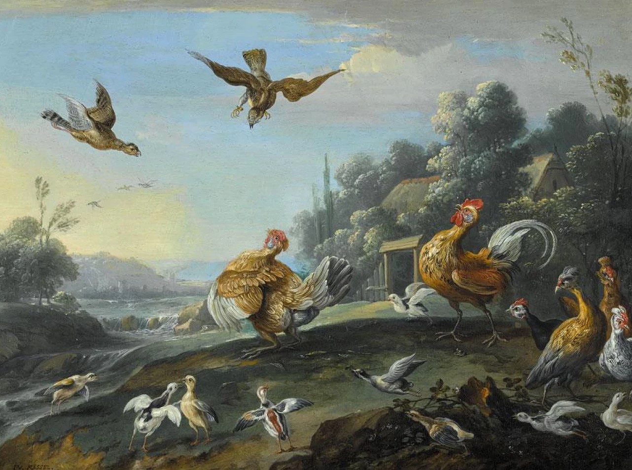 CHICKENS AND THEIR YOUNG DISTURBED BY SPARROW HAWKS