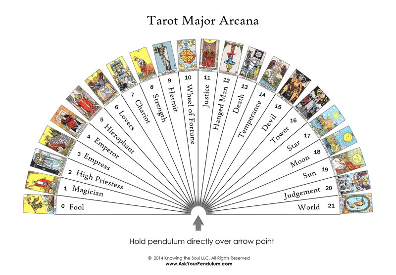 К слову о Таро, тоже можно прекрасно поработать по шкале с маятником. Мы когда хотим выбрать для себя сильную карту при работе. Например формулируем вопрос так: у меня есть проблемы в здоровье, какая карта Таро мне поможет? Или такой вопрос: у меня есть проблемы в работе, мало денег, какая карта Таро мне поможет? Если карт несколько, то сначала важно спросить, тоже по шкале, сколько карт Таро мне нужно использовать?