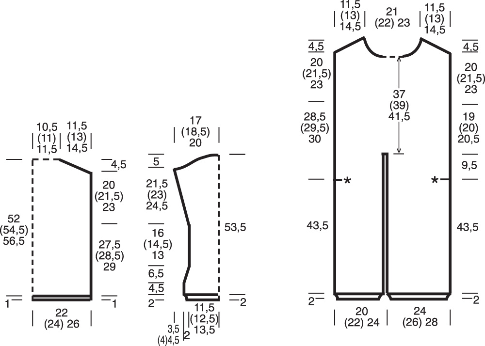 Через 27 см = 72 ряда (25,5 см = 68 рядов) 24 см = 64 ряда от планки прибавить с обеих сторон 1 x 1 п., затем в каждом 6-м ряду 6 x 1 п. и в каждом 4-м ряду 3 (4) 5 x 1 п. = 63 (69) 75 п.