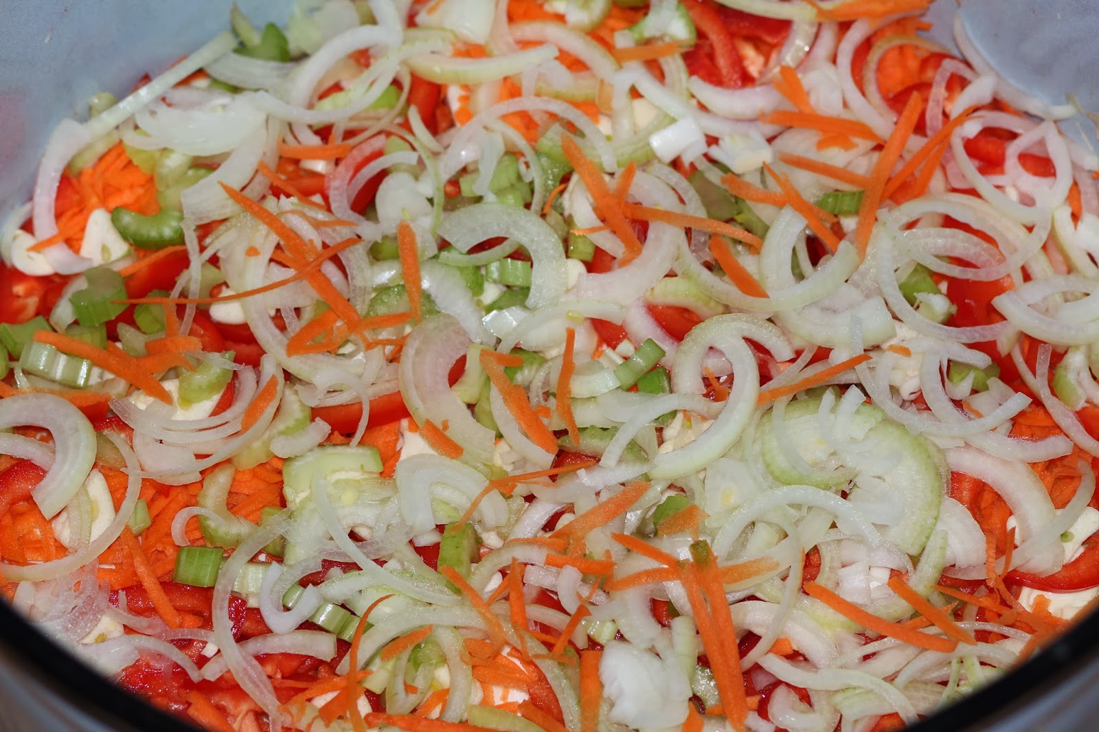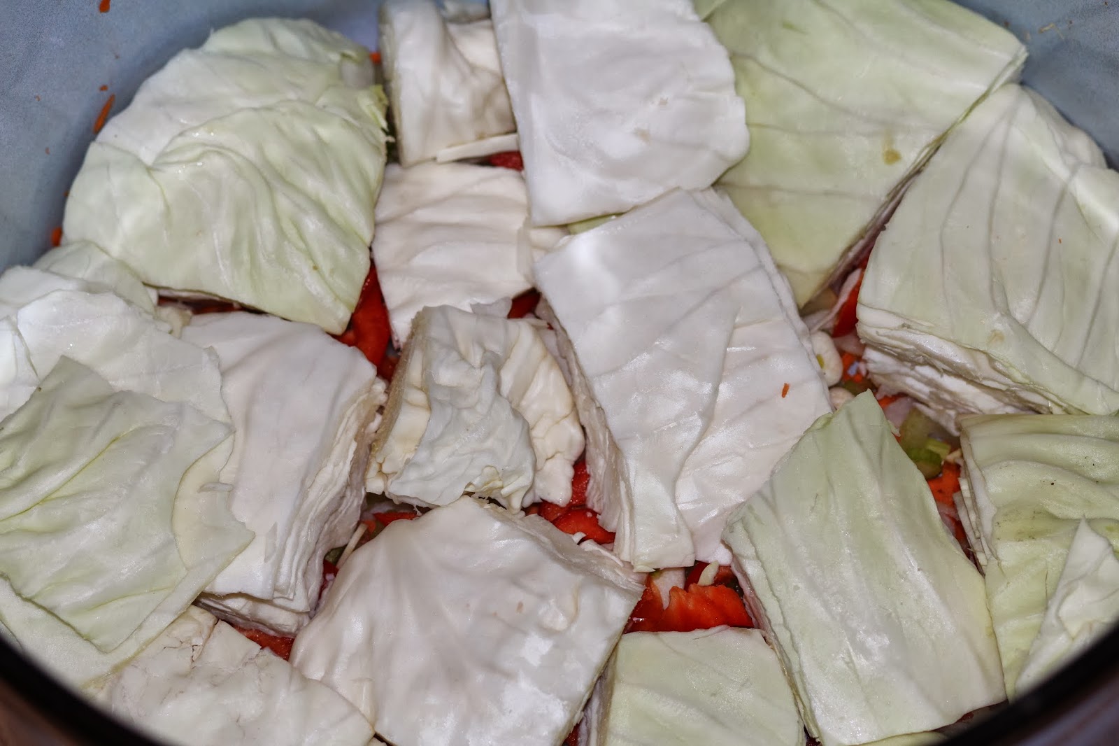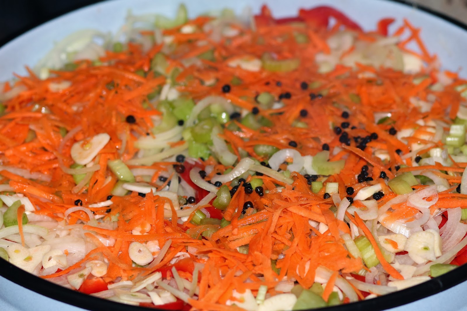 9. На капусту положить часть морковки, сельдерея, перца, чеснока и лука. Следующий слой будет капуста, сверху овощи и так далее пока не выложите все овощи. Последний слой у Вас должен быть овощной.
