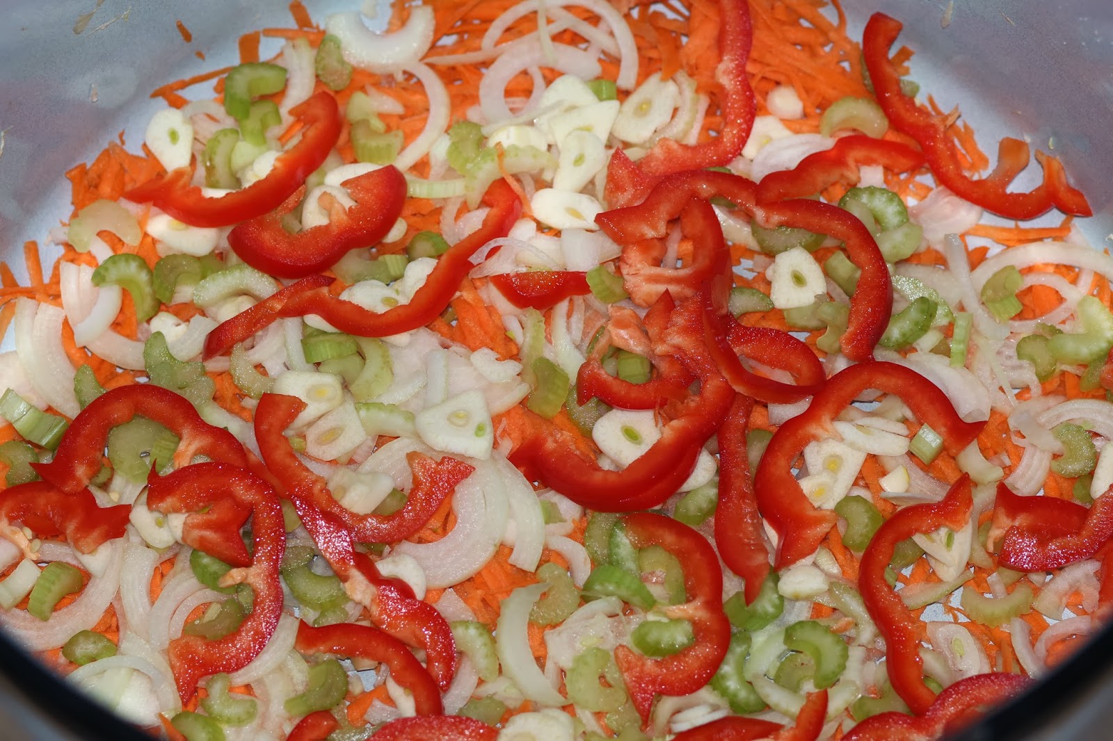 7. На дно кастрюльки выложить часть перца, лука, морковки, чеснока и сельдерея.