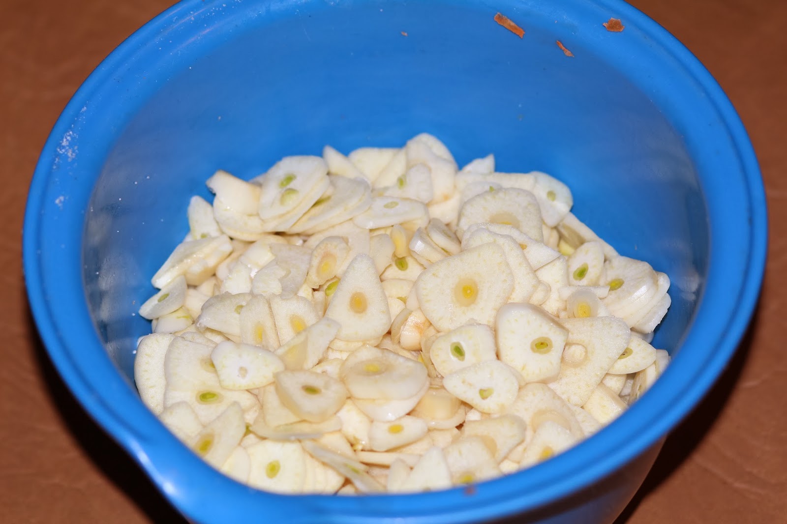 4. Чеснок нарезать пластинками.