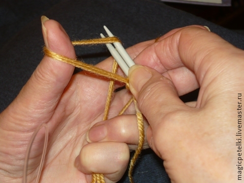 Подводим спицы уже с внутренней стороны большого пальца и набираем третью петлю, продолжаем набирать петли то с внешней, то с внутренней стороны пальца.