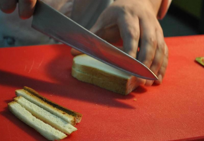 С хлебных ломтиков срежьте корки. Разделочную доску застелите пищевой пленкой, разложите ломтики хлеба слегка внахлест, пройдитесь по ним скалкой, чтобы получилось подобие коржа прямоугольной формы.