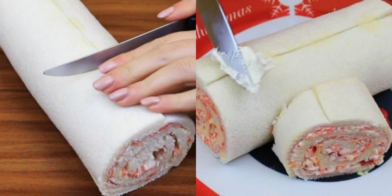 Чтобы еще больше упростить себе задачу, вместо замешивания теста и выпекания коржа для основы будем использовать мягкий хлеб для тостов — он отлично держит форму! Можете быть уверены: рулет не размокнет, как это может случиться в случае с лавашом.