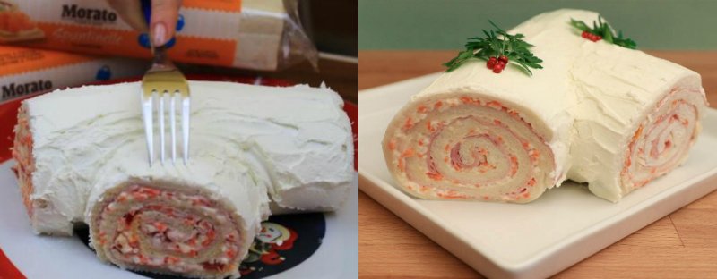 Популярнейшее «Рождественское полено» можно приготовить не только в виде десерта, но и закуски, выполнение которой займет от силы полчаса.
