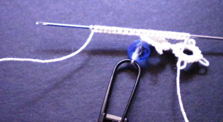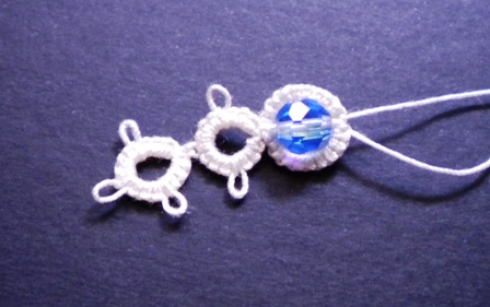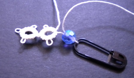 | Здесь, шарик будет добавлен ко второму кольцу раскол. Чтобы добавить бисер, я вытащить мяч нитью через шарик и удерживать его с помощью штифта (скрепки также будет делать), то узел нити (как то, что, как правило, сделано в иглу-фриволите после каждого элемента) |