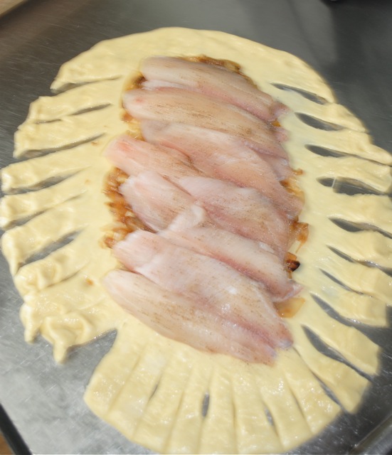 Оплетаем начинку полосками теста по типу "косички". "Рыбий хвост" оставляем незагнутым.