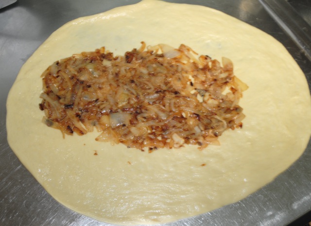Распределяем на тесте слой лука в центре, ближе к одному из узких краев овала.