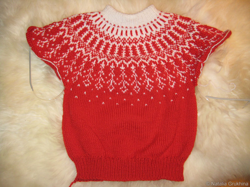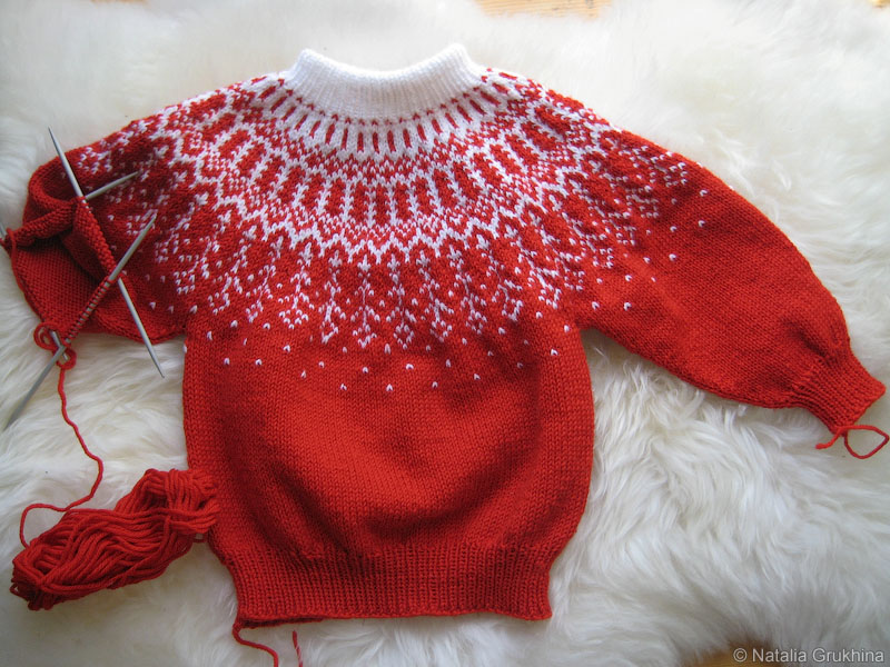 Благодаря интересному жаккардовому рисунку и круглой кокетке, неотъемлимому элементу норвежских свитеров, а также за счет красно-белого цветового решения, этот свитер смотрится очень актуально в зимний период, особенно в период новогодних праздников.