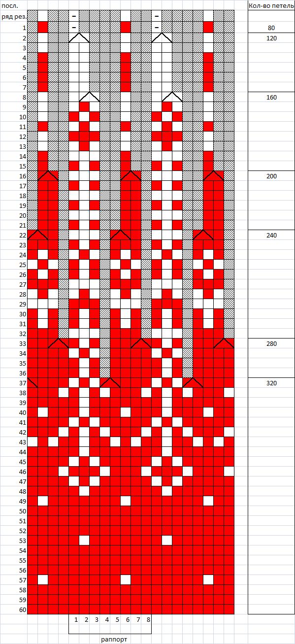 4. После того как связаны все ряды рисунка, провязать лицевой гладью еще 40 рядов (или больше, до нужной длины) и в следующем ряду перейти на вязание резинкой 1 на 1, равномерно убавив 32 петли, провязав вместе каждую 4-ую и 5-ую петли (при этом в работе останется 128 петель).