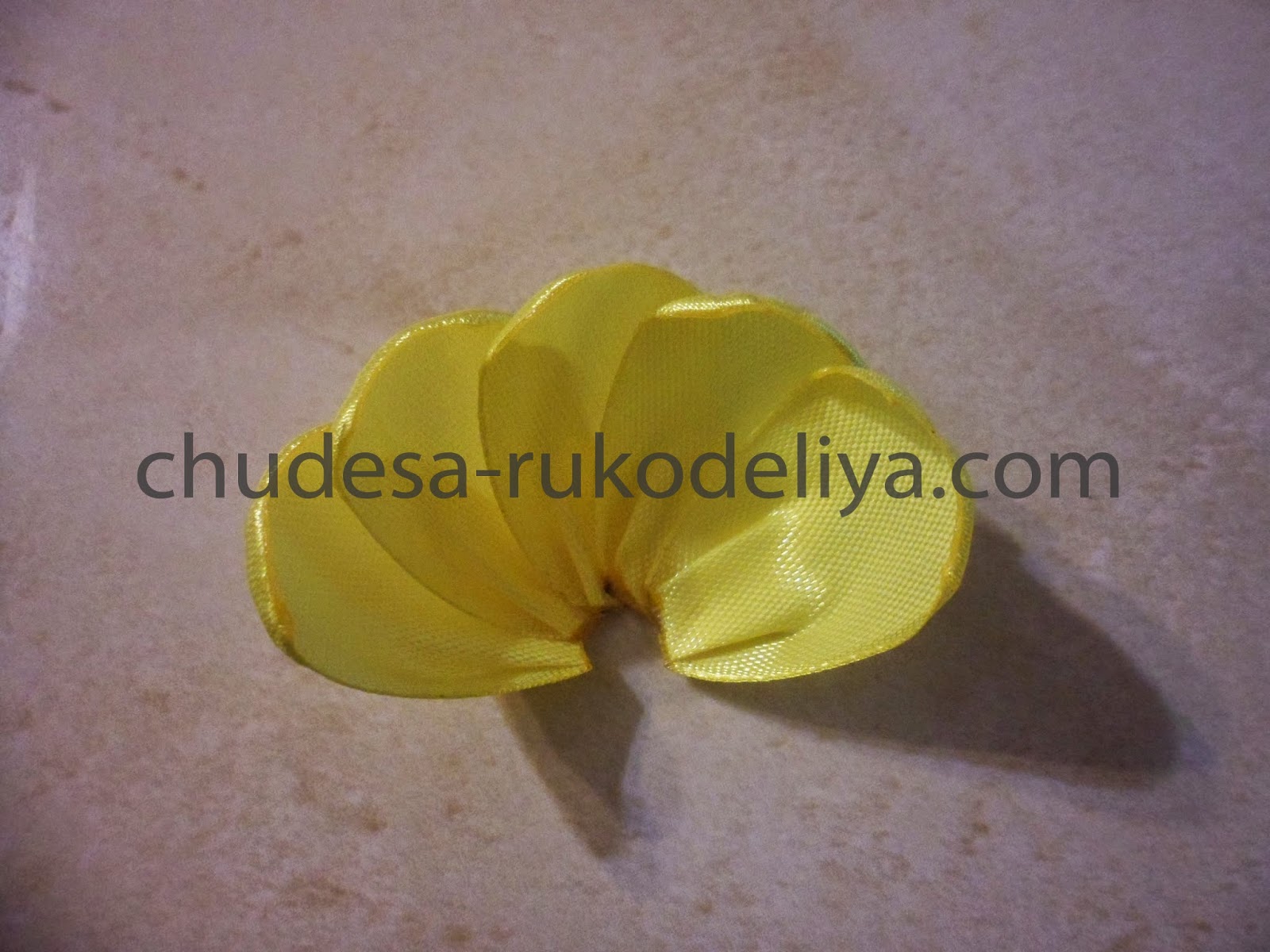Нарезаем ленту. Для серединки я выбрала ленту желтого цвета, ее нужно 5 отрезков длиной 4 см.