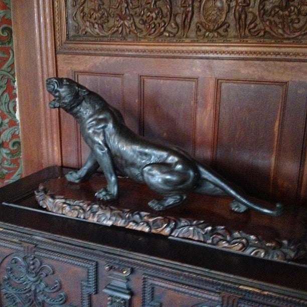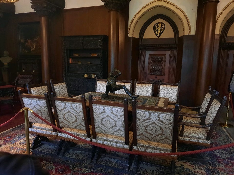 Верхняя часть камина украшена двумя скульптурами львов в рыцарских геральдический шлем. Зал украшают две картины: «Даная» школы Тициана и «Похищение сабинянок» — школы Пауля Рубенса (оригиналы картин экспонируются в художественной галерее Прадо, Мадрид. На старинном сундуке в стиле Ренессанс расположены японские, и напротив — китайские вазы. Мебель, собранная в этом зале, дает представление о жизни в XIX веке.