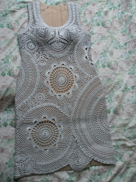 Костюм состоит из кардигана, связанного спицами, и платья, связанного крючком