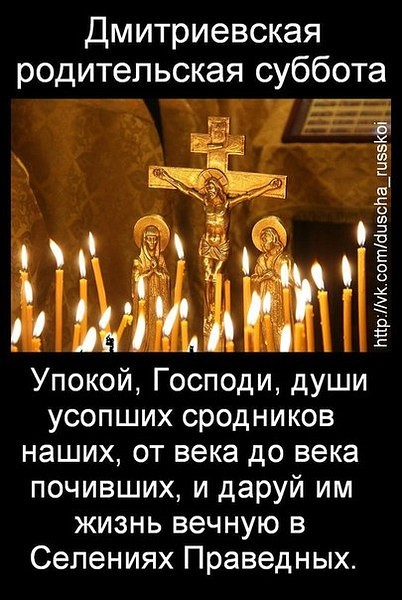......Димитриевская родительская суббота, которая изначально была предназначена для поминовения воинов, павших в Куликовской битве, но постепенно стала общим поминальным днем.