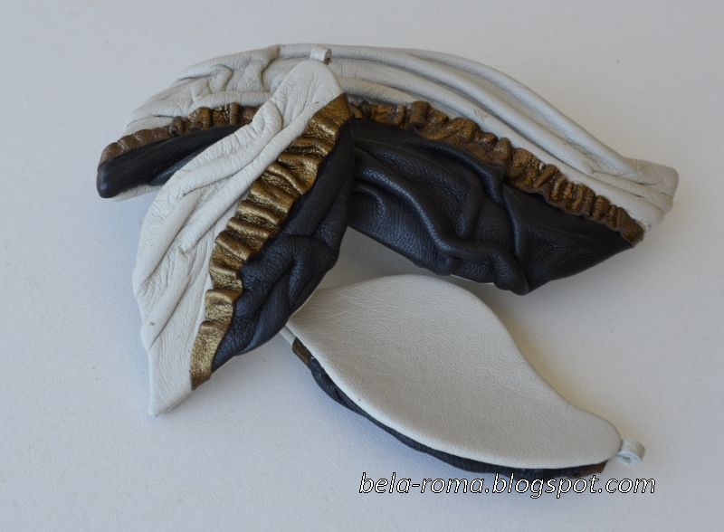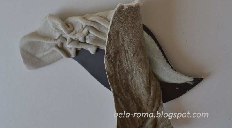 Кусочки кожи двух цветов заготавливаем приблизительной формы - по наитию. У меня это полукруг из кожи.