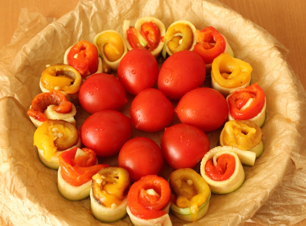 Выложить на разделочную доску ломтик кабачка, на него положить полоску перца и свернуть рулетом. Так поступить со всеми остальными ломтиками кабачка и перца. Форму для выпечки застелить пекарской бумагой и выложить рулетики. В оригинальном рецепте весь пирог состоит из рулетиков, но можно слегка разбавить их помидорами. Посолить, поперчить и сбрызнуть маслом.