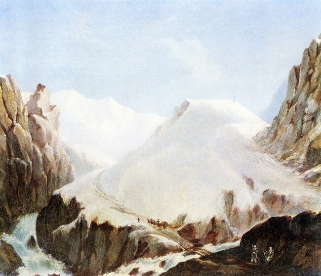 Вид Крестовой горы из ущелья близ Коби. Автолитография, раскрашенная акварелью. (1837-38г.г.). Автор: М.Ю. Лермонтов