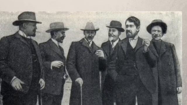 Групповой фотоснимок участников литературного объединения Среды. Первый ряд (слева направо) - Леонид Андреев, Федор Шаляпин, Иван Бунин, Николай Телешов, Константин Пятницкий. Второй ряд - Скиталец (С. Г. Петров), Максим Горький. 1902 год