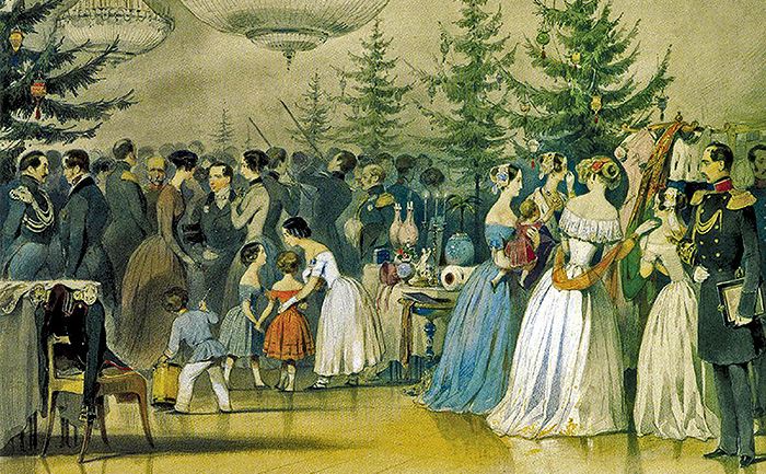 В России елка как рождественское дерево появилась в начале ХIХ века в домах петербургских немцев. В 1818 году по инициативе великой княгини Александры Федоровны была устроена елка в Москве, а на следующий год — в петербургском Аничковом дворце. На Рождество 1828 года Александра Федоровна, к тому времени уже императрица, организовала первый праздник “детской елки” в собственном дворце для пяти своих детей и племянниц — дочерей великого князя Михаила Павловича. Елка была установлена в Большой столовой дворца.