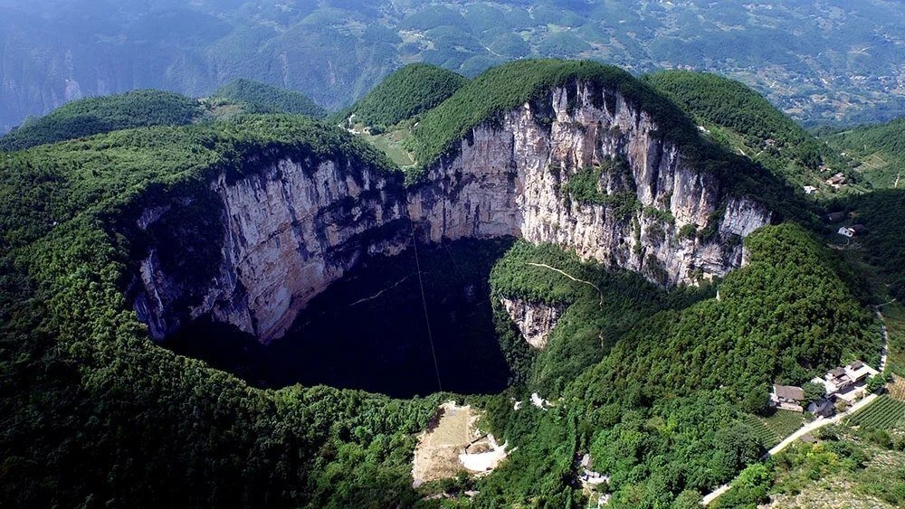 Небесная Яма.Уезд Фынцзе, город Чунцин,Глубочайшая карстовая воронка в мире (662 м). Размер — 626 на 537 м, объём — почти 120 млн м³. Ко дну воронки ведёт лестница с 2800 ступенями.Это грандиозное творение воды расположено в Китае, недалеко от крупного города Чунцин. На китайском языке название Небесной ямы звучит как Сяочжай Тянкен. Местные горные породы представлены известняками, которые весьма неустойчивы к разрушительному воздействию воды. Автором Небесной ямы считается подземная река, протекающая в пещере Дифен, воды которой и растворили известняки. Река до сих пор протекает под воронкой, и, возможно, ее глубина в будущем увеличится.