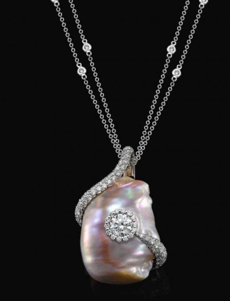 Оттенки золотистого, фисташкового и лилового цвета самые ценные у Кеши. Ожерелье с жемчугом Кеши и жемчужинами Южных Морей.
