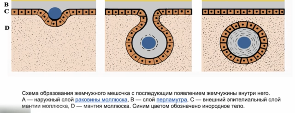 "Жемчуг - образования (обычно округлые), возникающие внутри раковин некоторых пластинчато-жаберных моллюсков - морских и пресноводных, выстилающих свои раковины перламутром. Жемчуг образуется путем обволакивания попавших в раковину инородных частиц (песчинок и т.п.) тонкими концентричными слоями арагонита (реже - кальцита), в смеси с конхиолином. Жемчуг ценится издревле. В Японии в промышленных масштабах выращивается так называемый "культивированный" жемчуг на специальных морских плантациях (в раковины моллюсков-жемчужниц вводятся посторонние тела, служащие основой будущих жемчужин)" (из Энциклопедического словаря).