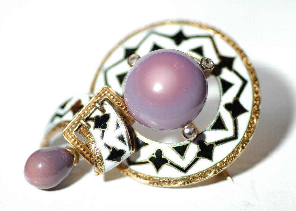 брошь, украшенная тремя важными мотивами: веером, луной и японским кустовым клевером