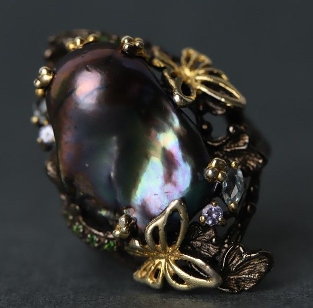 Характерный павлиний перелив натурального тёмного жемчуга.