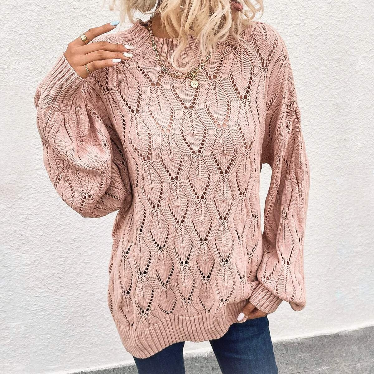 Джемпер удлинённого расслабленного фасона оверсайз со спущенными рукавами, связанный эффектным, но совсем не сложным ажурным узором в виде листьев.