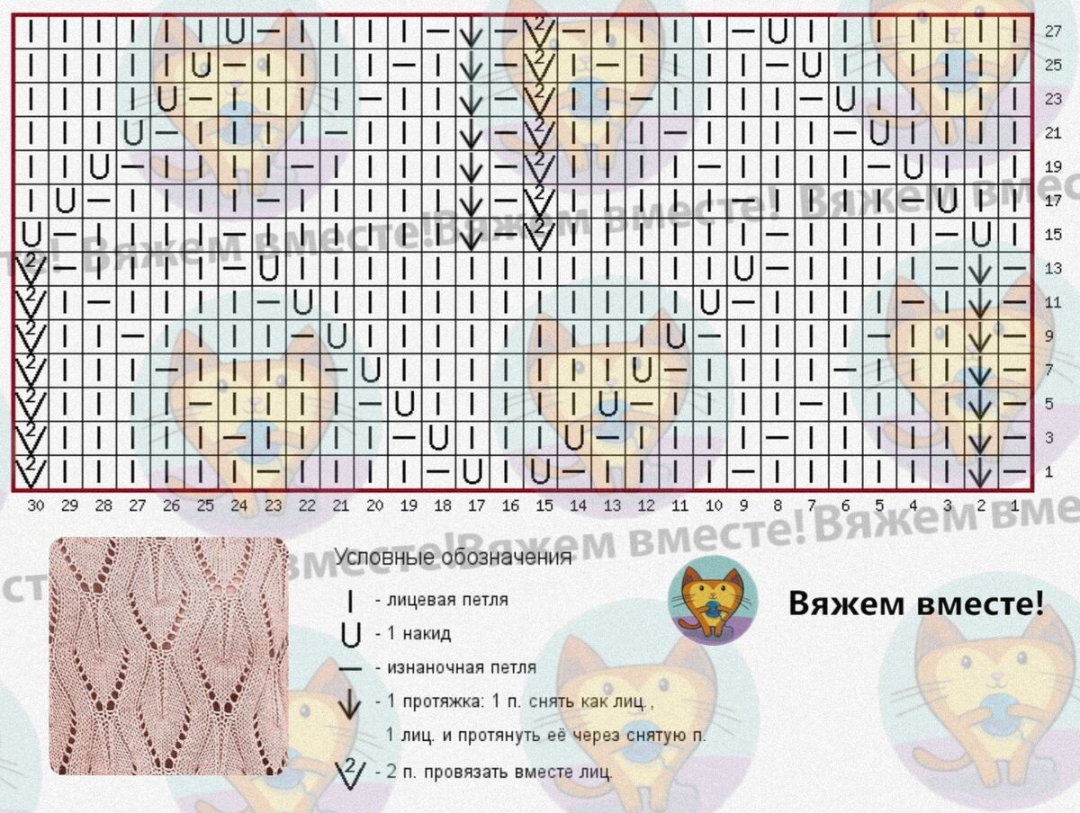Узор вяжется по схеме ниже. Раппорт равен 30 петлям по ширине и 28 рядам по высоте.