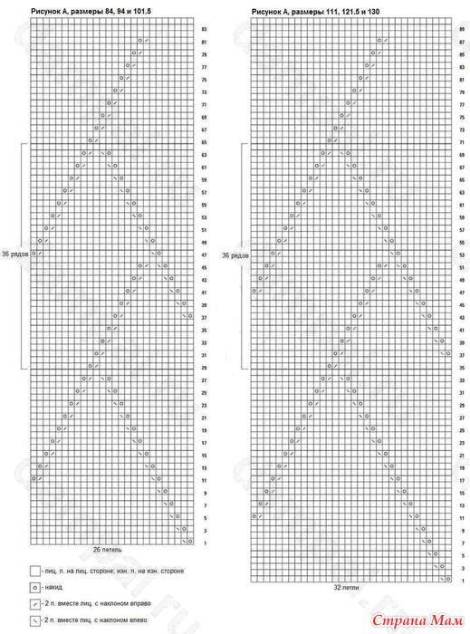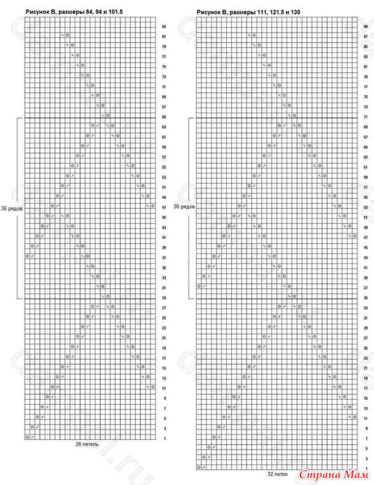 Вязать до 64 (64, 64, 70, 70, 70)-го ряда рисунков включительно, затем 1 раз связать ряды 65-84 (65-84, 65-84, 71-90, 71-90, 71-90), затем вязать платочной вязкой и лицевой гладью в установленном порядке.