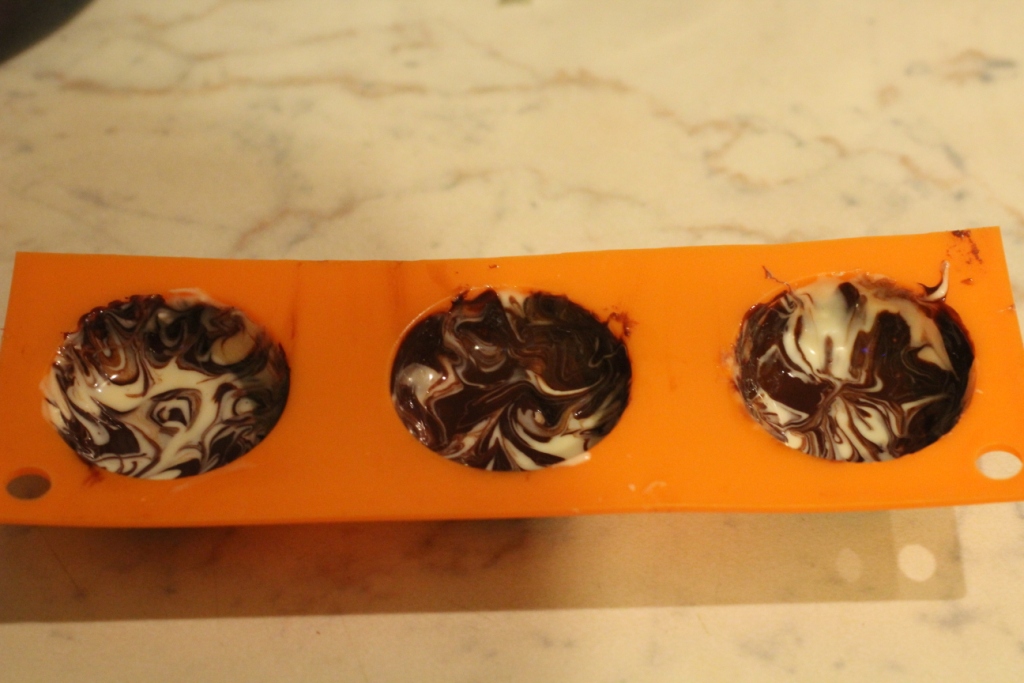 Теперь делаем мраморные конфеты. Белый и темный шоколад по очереди наносим на стенки формы. Теперь формы нужно слегка наклонять и крутить, чтобы шоколад немного перемешался и равномерно распределился по стенкам. Можно перемешать при помощи деревянной шпажки. Охладить 10 минут в морозильной камере.