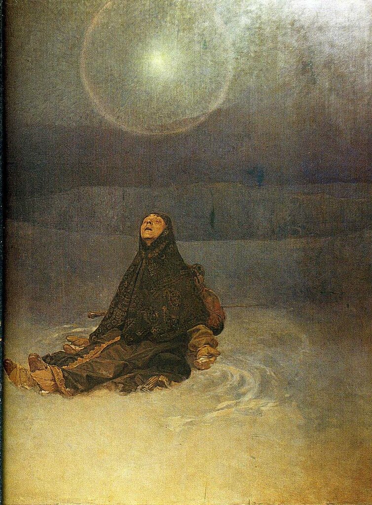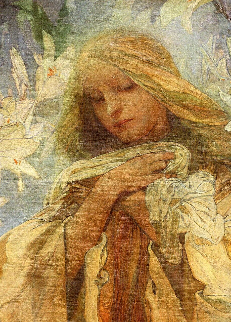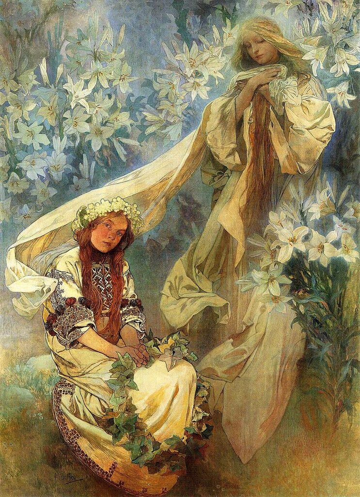 Сюжет Пречистая Дева, а небесное видение Мадонны Альфонс Муха подчеркнул изображением лилий, символом чистоты. Сидящая девушка, одетая в национальный костюм держит в руках венок из листьев, символ памяти.