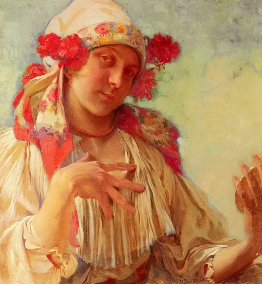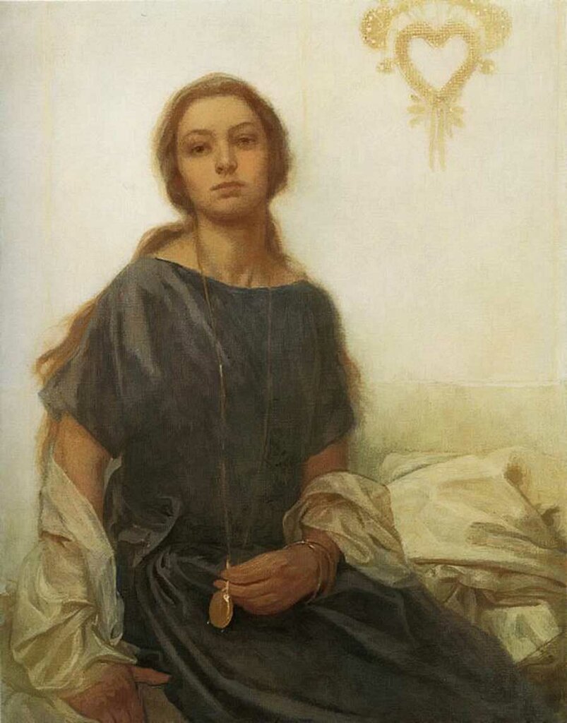 У Мухи практически не встречается изображений обнаженных натур, но он умел «одеть» женщину так, чтобы подчеркнуть ее достоинства. Муха нарочито использовал контраст между здоровым загаром лица и кистей рук с одной стороны и белой кожей плеч – с другой, что делает его героинь еще более «раздетыми». Интересно, что натурщицы в мастерской Мухи, судя по фотографиям, частенько позировали обнаженными. Поневоле вспоминается рассказ Роальда Даля «Отпущение грехов», в котором один знаменитый художник писал светских дам без покровов, затем в нижнем белье, затем дорисовывал одежду перед официальным показом картин. Он объяснял это необходимостью иметь правильное представление о фигуре. Герой рассказа, случайно узнав об этой тайне, довольно мерзким способом (нетрудно догадаться каким) осуществляет свою месть пренебрегшей им даме.