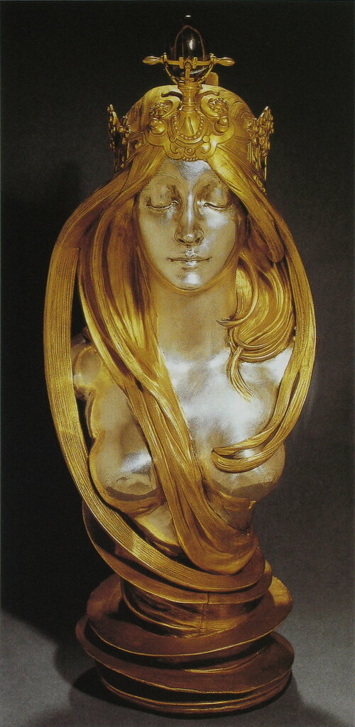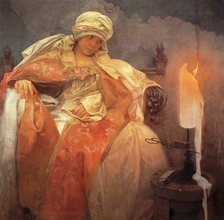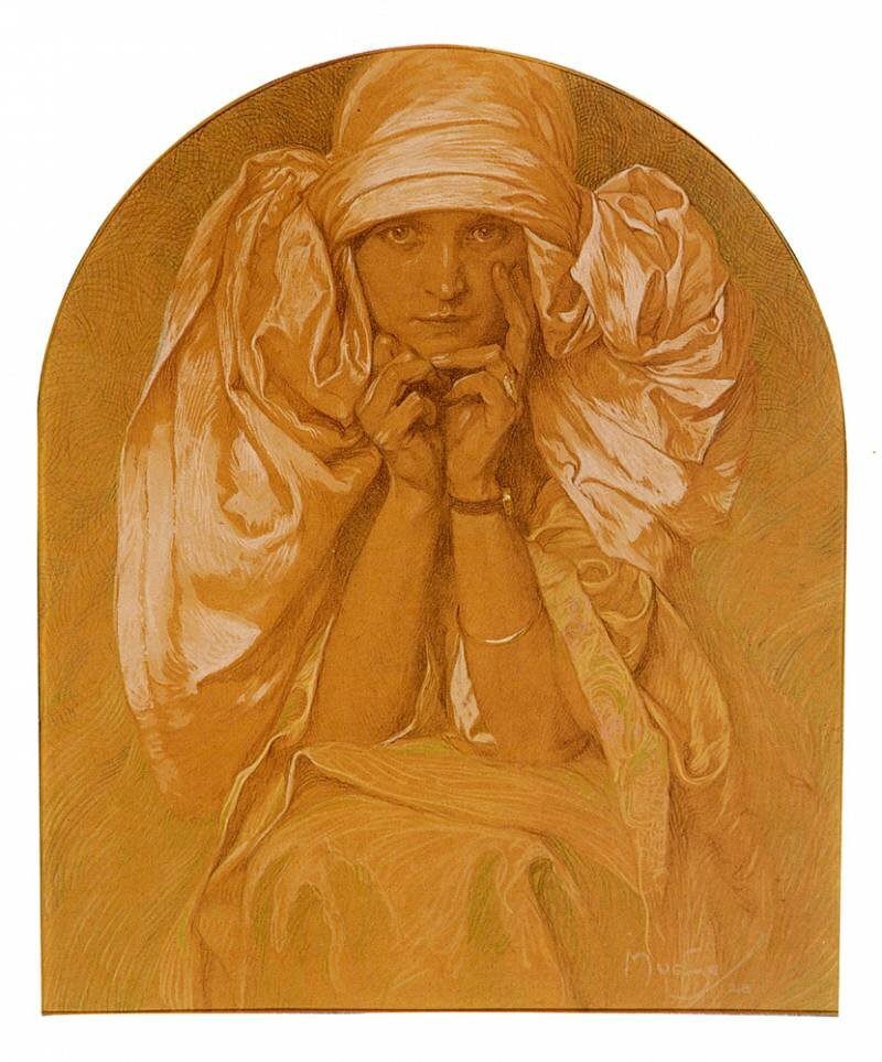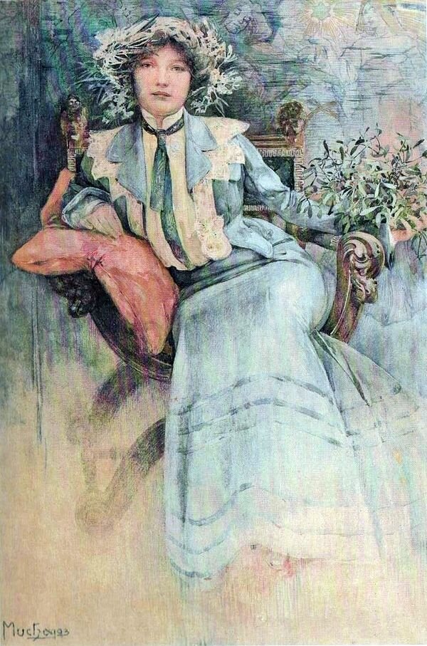 Альфонс Мариа Муха (чеш. Alfons Maria Mucha; 24 июля 1860 — 14 июля 1939) — чешский живописец, театральный художник, иллюстратор, ювелирный дизайнер и плакатист, один из наиболее известных представителей стиля «модерн». Все его творчество посвященно изображению женской красоты. Прекрасные дамы - его модели, его хлеб, его жизнь и судьба. И самая прекрасная из них собственно и открыла его талант. Воспевание ее красоты принесло ему успех и известность.