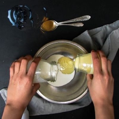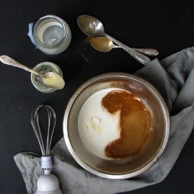 Подготовив всё необходимое, сперва смешайте сливки со сгущёнкой, а затем добавьте растворимый кофе. Разумеется, кофе можно заменить и иными добавками вроде ванили, столовой ложки любимого ликёра или пары капель пищевых ароматических эссенций.