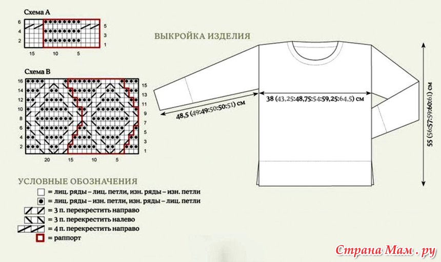 1-й р. (= лиц. ряд): вязать лицевыми до отметки, перенести отметку, выполнить 1 -й р. узора из «кос» по схеме А до отметки, перенести отметку, вязать лицевыми до конца ряда.