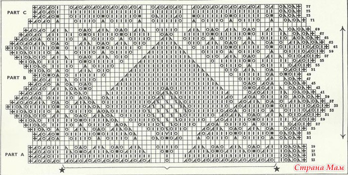 Начинаем вязать с 13 ряда. Это схема пледа, и нужно переводить еще что и как. Но думаю что каждый сможет себе подобрать кайму, кому какая понравится. Главное что основной рисунок начинается именно с 13-го ряда. А с 21-го по 70-й ряд повторять столько, сколько нужно. Каждый выбирает себе длину сам. И закончить узор последними рядами с 71-го по 78 ряд.