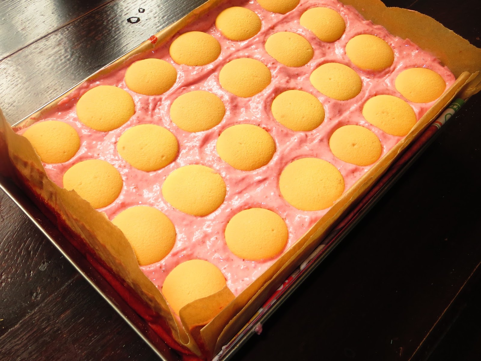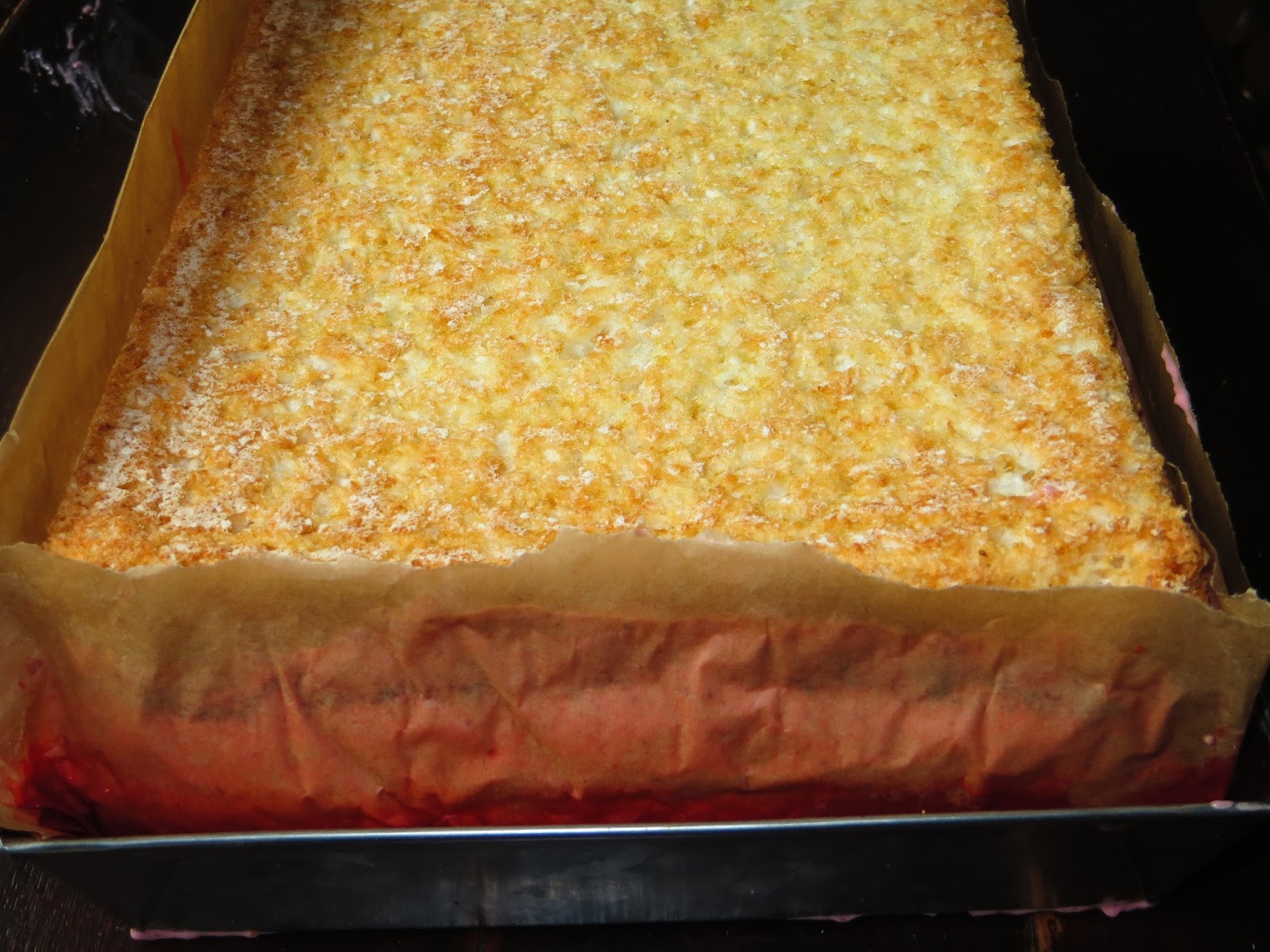 Белки взбить с сахаром чтобы получить глянцевый безе. Затем добавить кокосовую стружку, смешанную с разрыхлителем. Аккуратно, но тщательно перемешать. Выпекать в течение 25 минут при темп. 180 градусов. Охладить