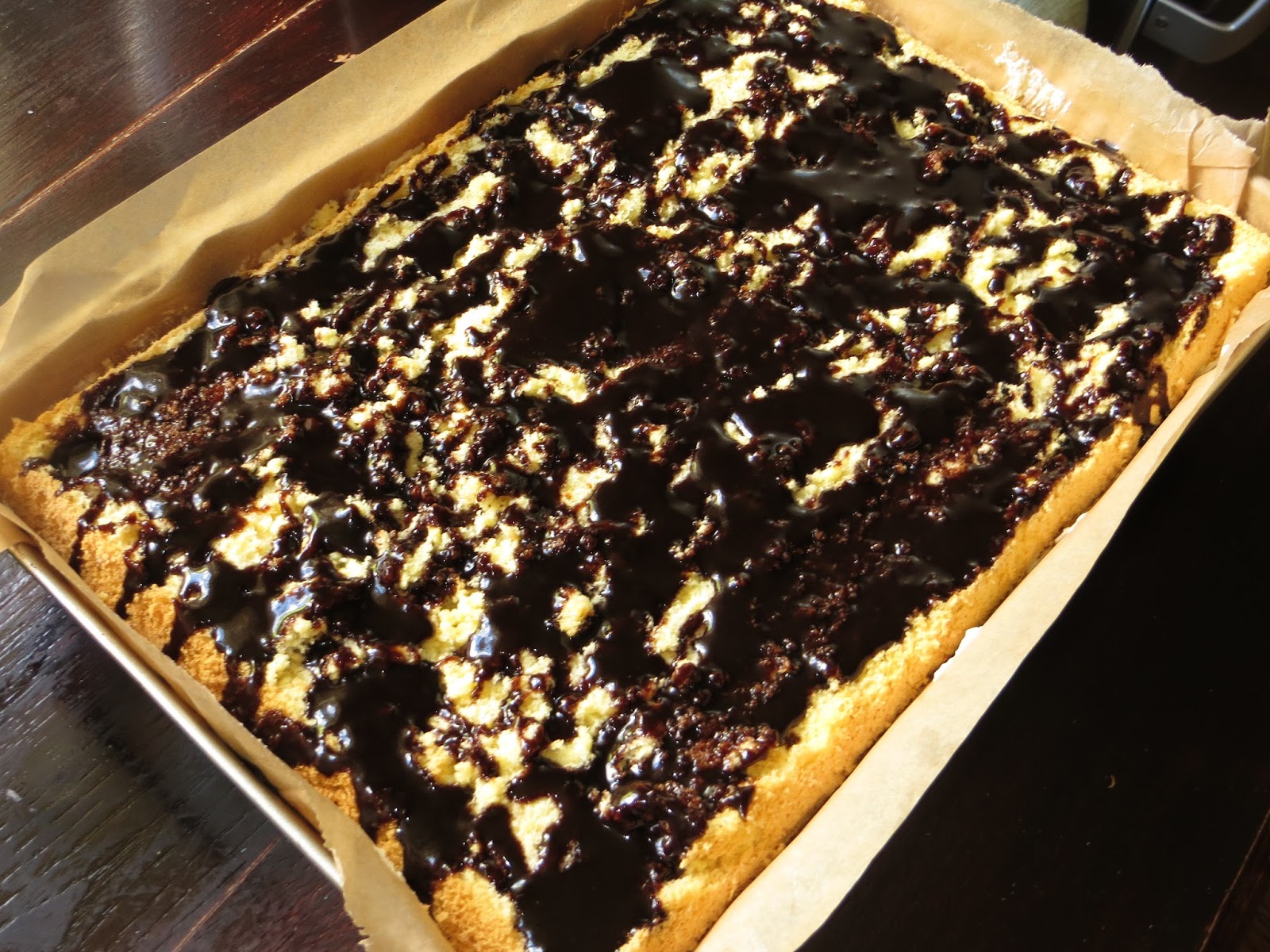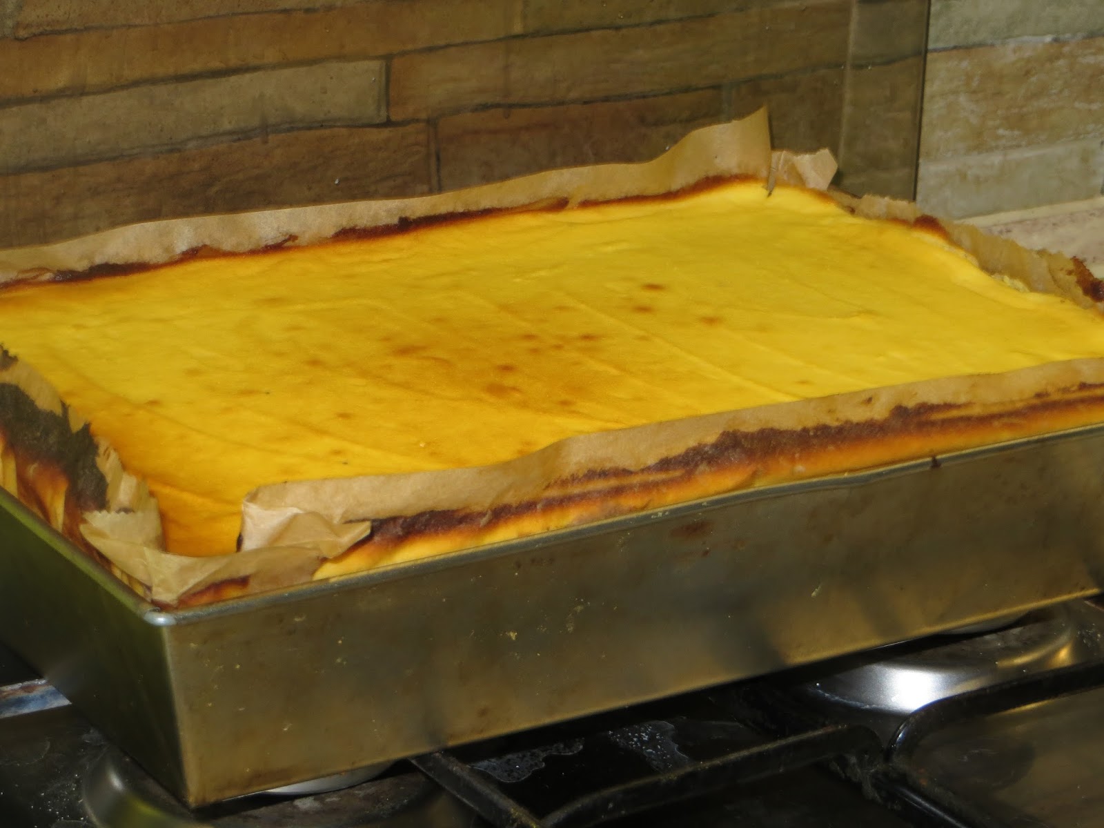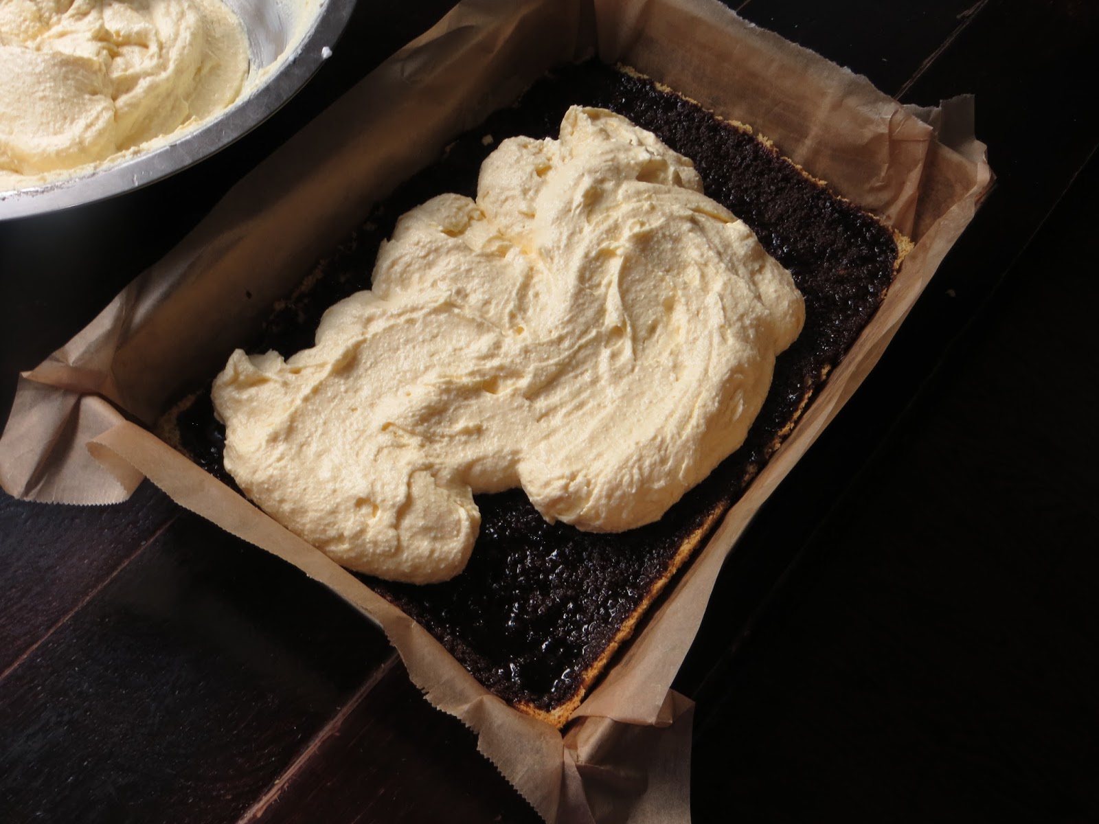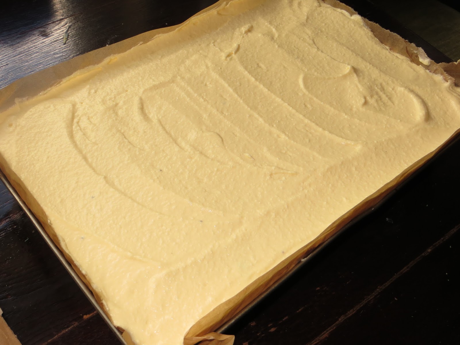 Белки были отделены от желтков ивзбить . В конце добавить сахар и взить в высокие пики Добавить яичные желтки и перемешать миксером на самой низкой скорости. Затем просеивают муку с разрыхлителем и осторожно, но тщательно перемешать. Выпекать в течение 35 минут при температуре. 175 градусов. Охладить Режем на две равные части