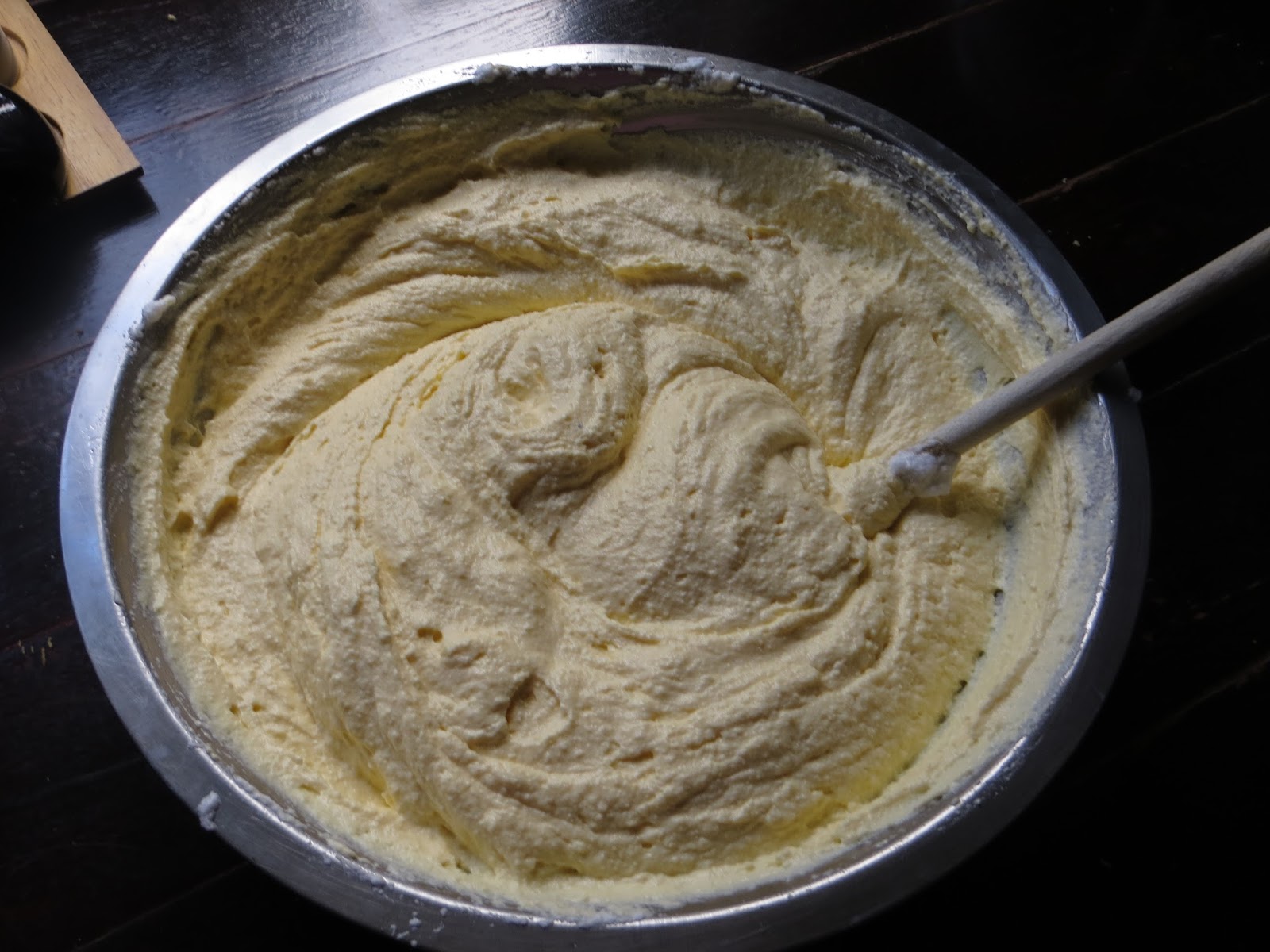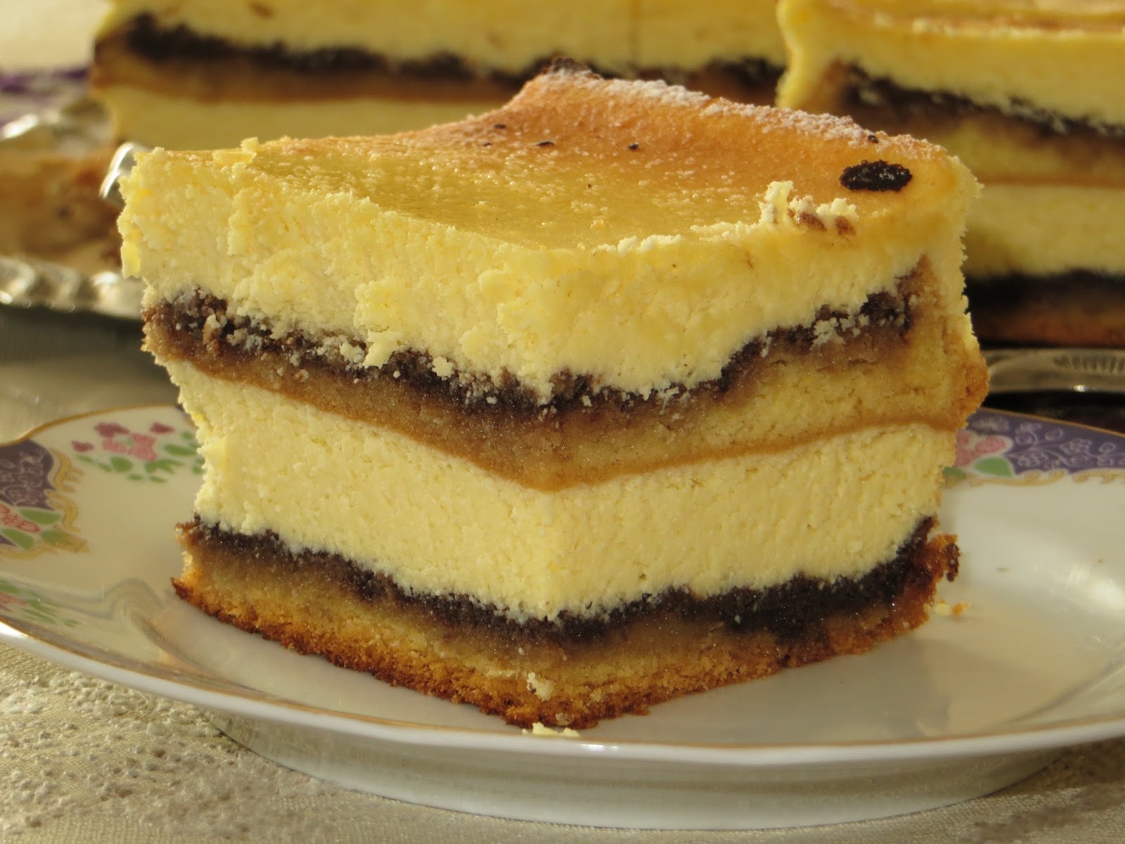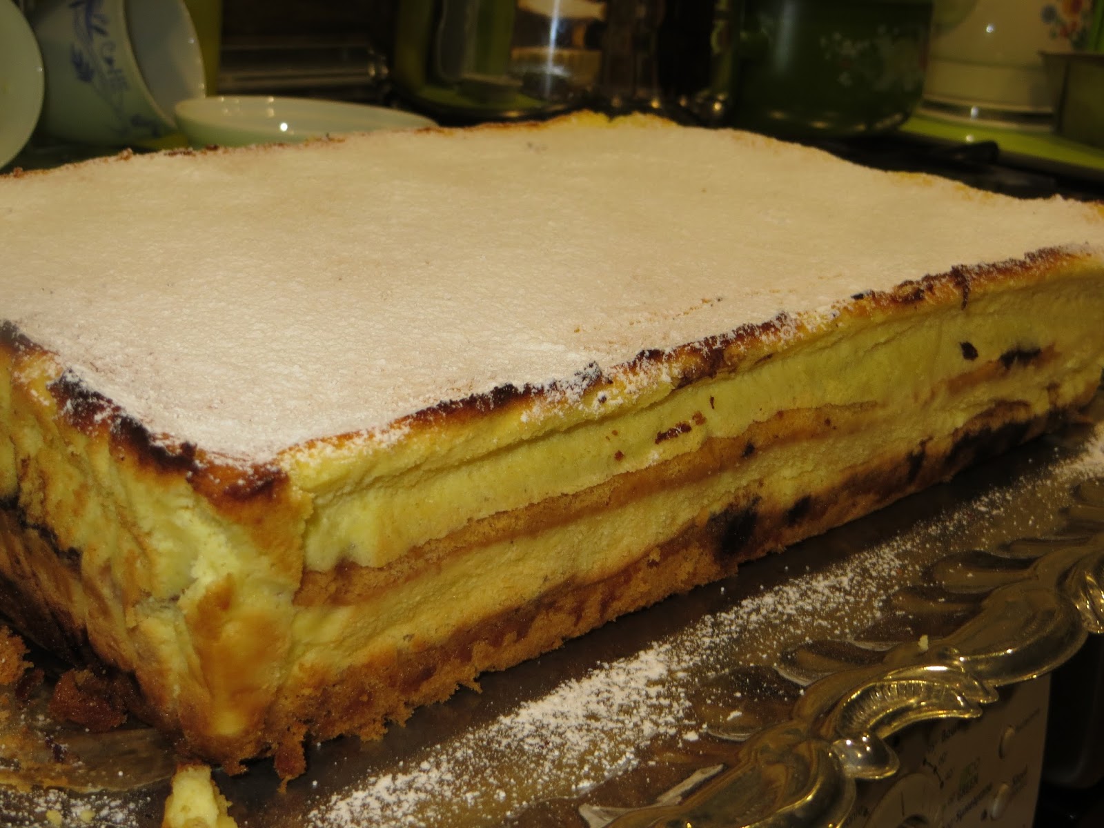 Маргарин, смешать с сахарной пудрой и растереть Постепенно добавить яичные желтки и творог, смешанные с пудингом. Белки взбить и осторожно смешать с сырной массой. Разделить на две части.