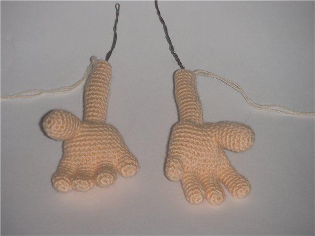 мизинец: 1 р. 2 в.п-6 сбн во вторую от крючка петлю 2 р. 6 пр= 12 сбн 3 р. (2,уб)- 3 раза = 9