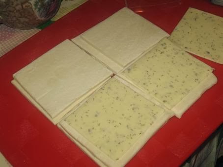 На каждый квадратик укладываем кусочек сыра. Этот сыр продаётся с разными начинками, что гарантирует разницу вкусов!