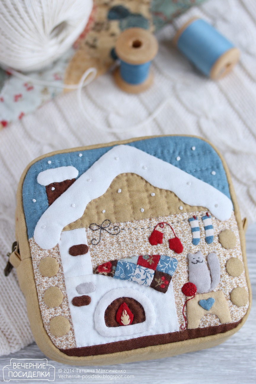 Продолжаю миниатюрить. И сегодня мини-мини жанровая картинка — зимняя избушка. Бревенчатая, с печкой. Оформила в косметичку естественно. :-) По форме косметичка — аккуратненький квадратик размер 12х12см. Какими же огромными теперь по сравнению с ней мне кажутся мишка и компания! Сама-то косметичка там даже меньше, всё дело в размере деталей. :-) Основа избушки, то есть небо, труба, крыша, стены и печка собраны как квилтовый блок, а вся остальная мелкотня — это уже нашитая сверху аппликация.